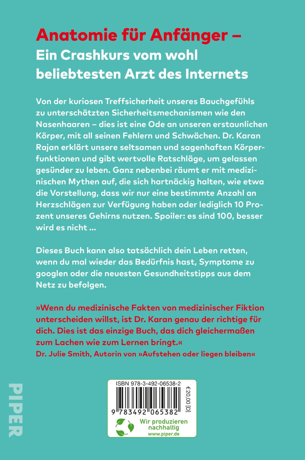 Dieses Buch ist eine Ode an unseren erstaunlichen Körper – mit all seinen Fehlern und Schwächen. Der wohl beliebteste Arzt des Internets, Dr. Karan Rajan, erklärt die seltsamen und sagenhaften Körperfunktionen, die uns in Schwung halten, gibt wertvolle Ratschläge, um gelassen gesünder zu leben, und räumt ganz nebenbei mit medizinischen Mythen auf, die sich hartnäckig halten. So rettet sein Buch vielleicht tatsächlich Leben, wenn wieder einmal Symptome gegoogelt oder die neuesten Gesundheitstipps aus dem Netz befolgt werden. Mit viel praktischem Wissen und einer großen Portion schwarzem Humor.