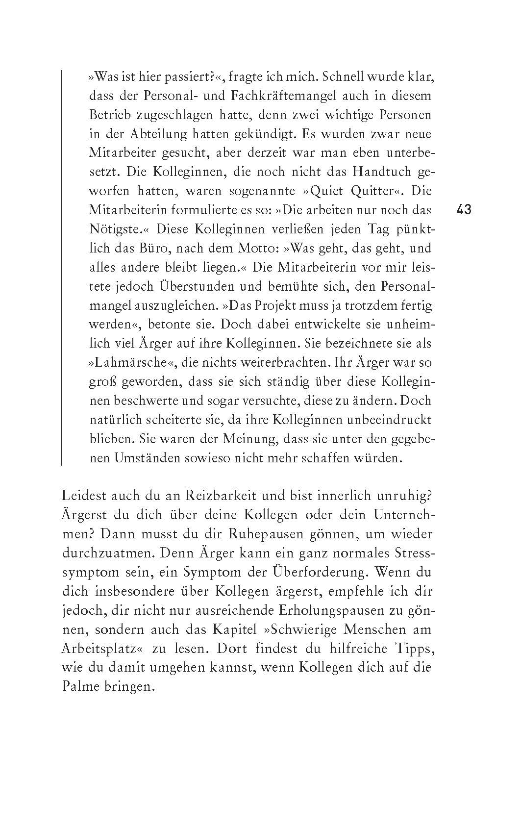 Egal, ob es darum geht, Überlastung zu reduzieren, besser mit Führungskräften oder schwierigen Kollegen und Kolleginnen umgehen zu können, die Gedankenkarussells abzustellen oder besser schlafen und „abschalten“ zu können – das Buch hilft, neue, entspannte Zukunftsperspektiven zu schaffen!