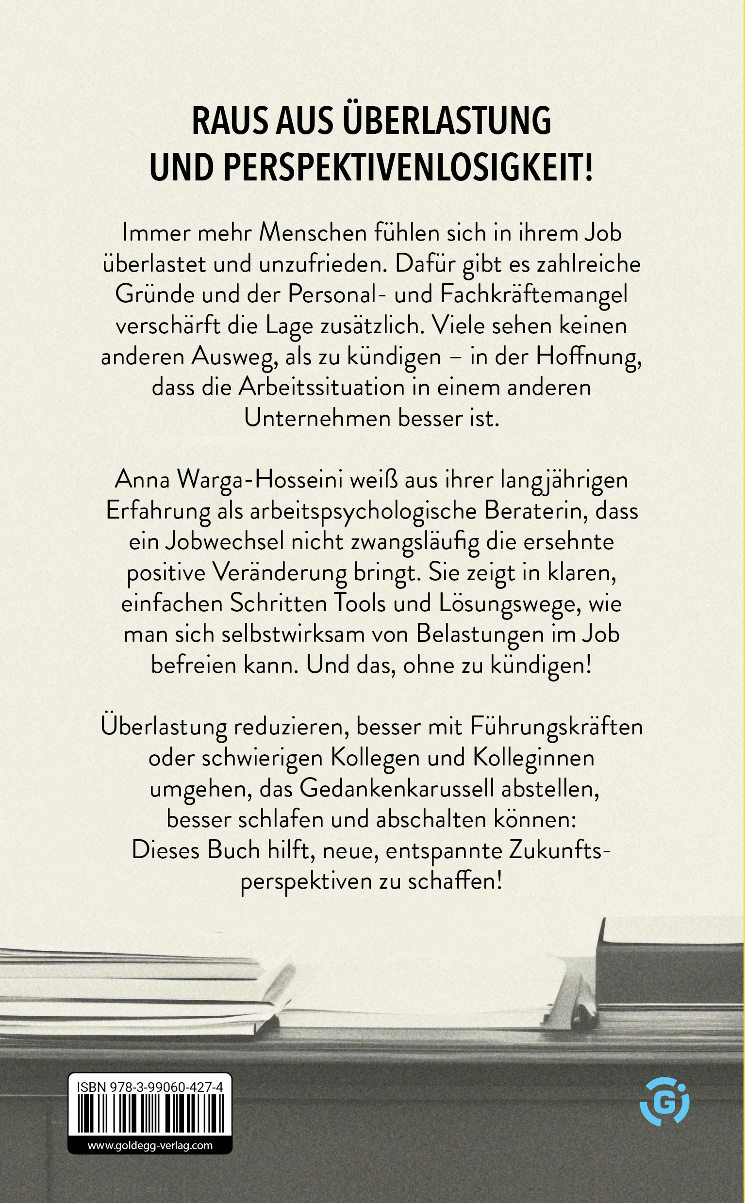 Die Autorin zeigt in diesem Buch in klaren, einfachen Schritten Tools und Lösungswege auf, wie sich jeder selbstwirksam von Belastungen im Job befreien kann – und das, ohne zu kündigen!