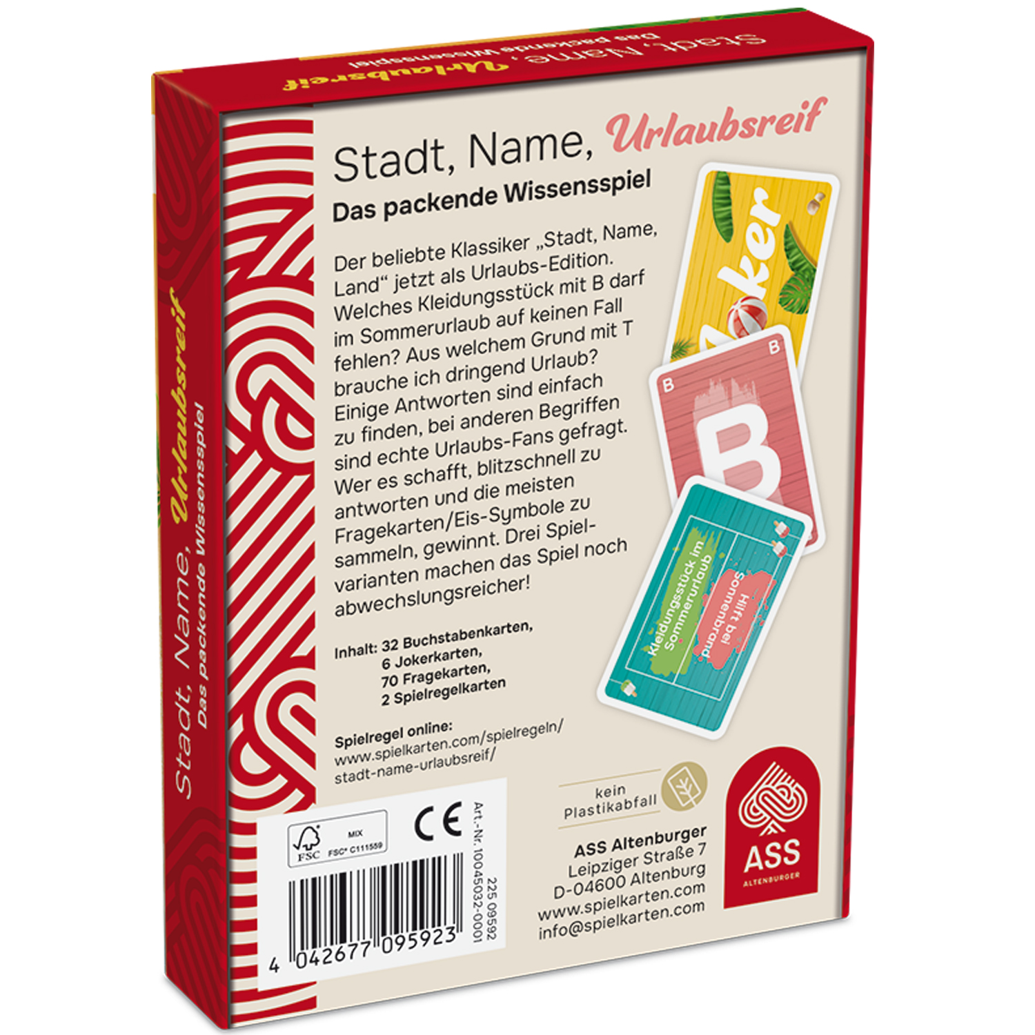 Stadt, Name, Urlaubsreif - Endlich Urlaub!Der beliebte Klassiker "Stadt, Name, Land" jetzt als Urlaubs-Edition. Welches Kleidungsstück mit B darf im Sommerurlaub auf keinen Fall fehlen? Welche Eissorte beginnt mit dem Buchstaben E? Aus welchem Grund mit T brauche ich dringend Urlaub? Einige Antworten sind einfach zu finden, bei anderen Begriffen sind echte Urlaub-Fans gefragt. Wer es schafft, blitzschnell zu antworten und die meisten Fragekarten / Eis-Symbole zu sammeln, gewinnt. Drei verschiedene Spielvarianten machen das Spiel noch spannender und abwechslungsreicher! Zudem kommt Stadt Name Urlaubsreif komplett ohne Plastik im Spiel aus. Die Karten sind statt in Plastik, mit Papier eingeschlagen und die Verpackung sowie die Karten bestehen aus FSC®-zertifiziertem Material und sind besonders schonend für die Umwelt. Inhalt: 32 Buchstabenkarten, 6 Jokerkarten, 70 Fragekarten, 2 Spielregelkarten