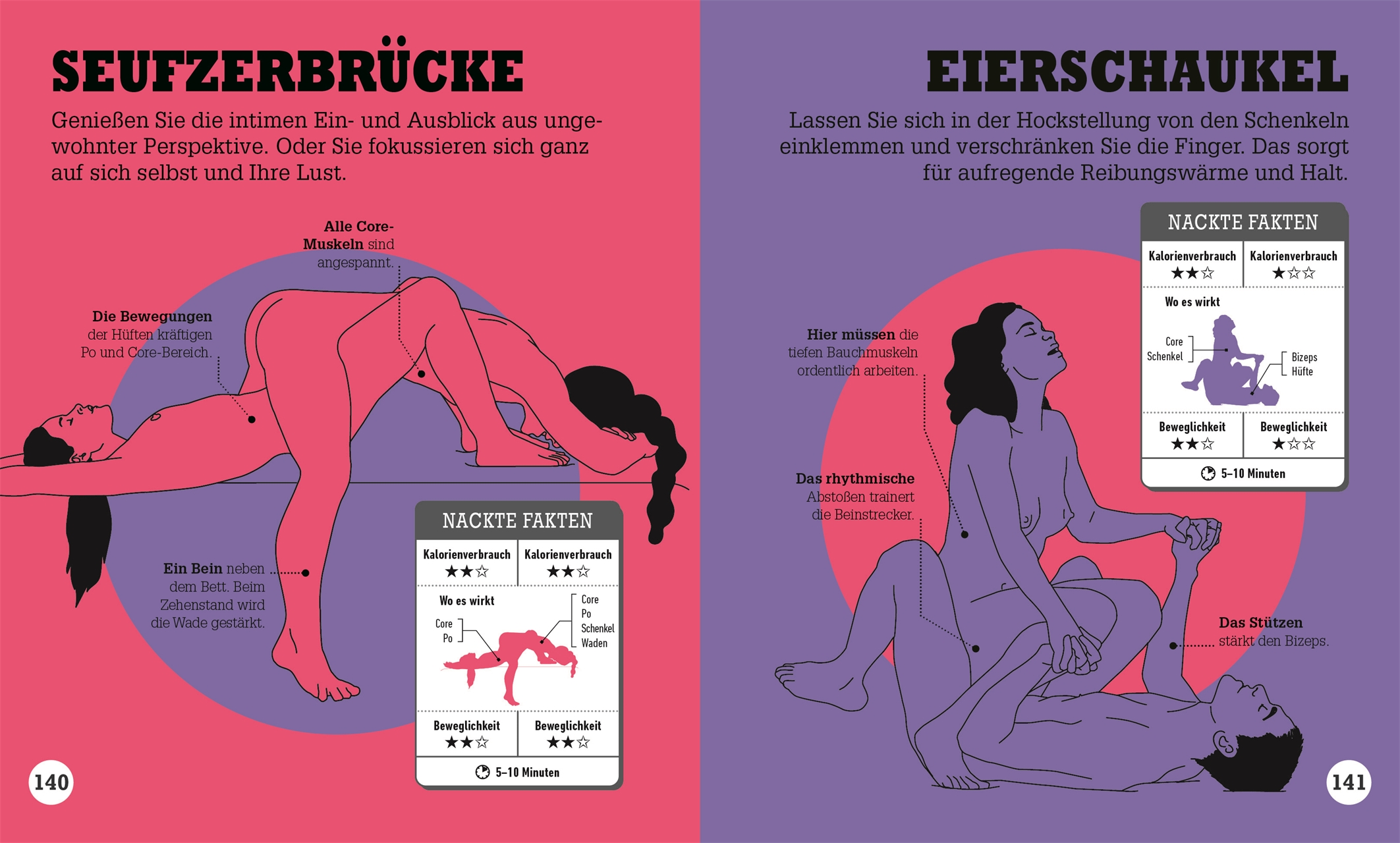 Zu jeder Position gibt es die Info, welche Muskeln beansprucht werden, wie beweglich die Paare sein sollten, wie viel Energie beim Bettsport verbrannt wird und wie lange die Stellung idealerweise zu halten ist. Ein prickelndes Geschenk nicht nur zum Valentinstag oder Junggesellenabschied.