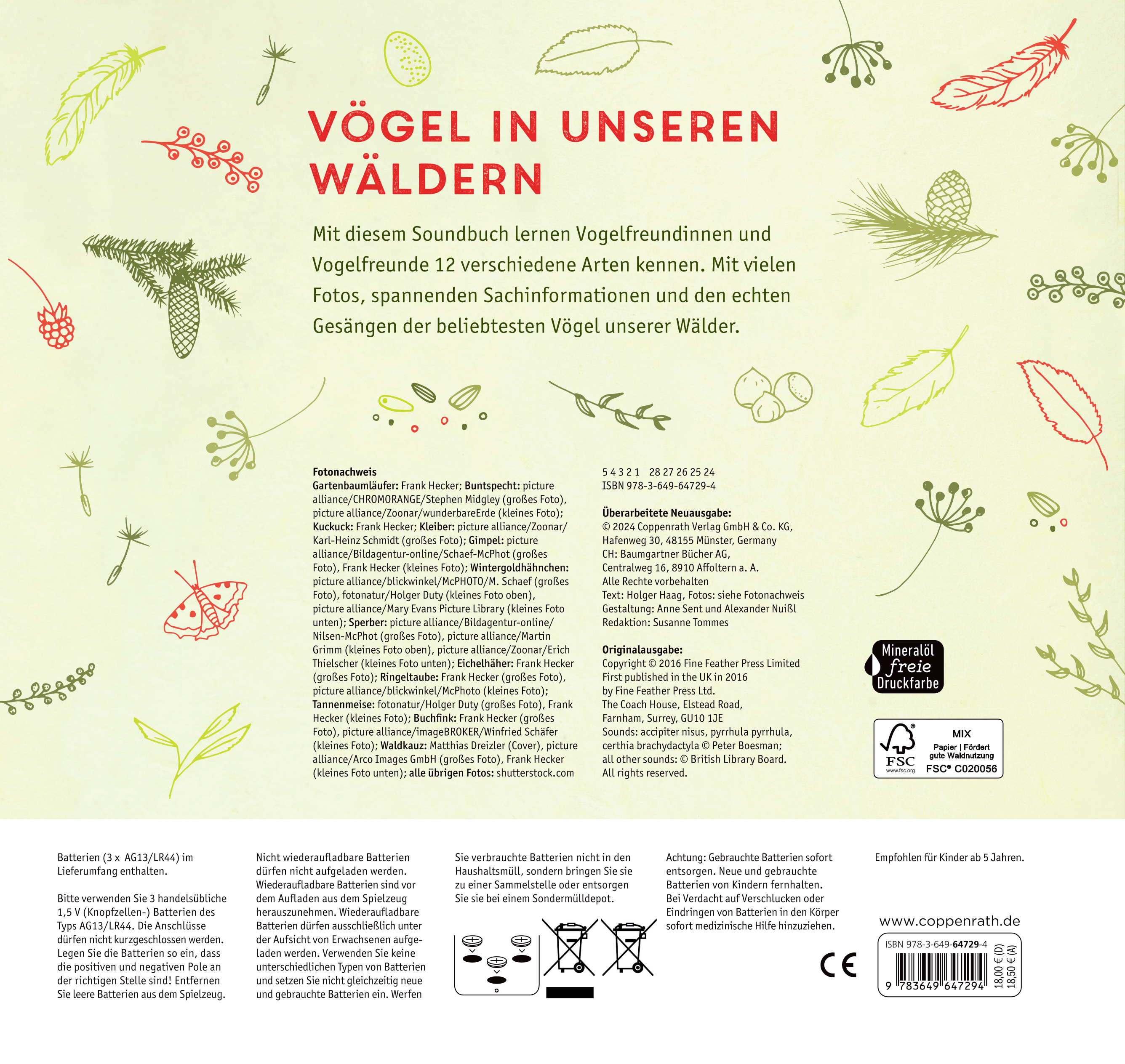 Mit diesem Soundbuch lernen kleine und große Vogelfans 12 verschiedene Arten kennen. Mit vielen Fotos, spannenden Sachinformationen und den echten Gesängen der beliebtesten Vögel unserer Wälder.