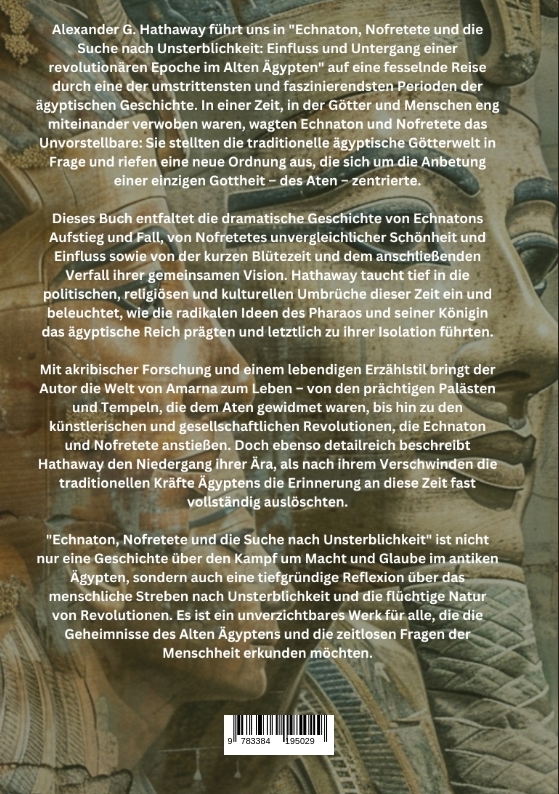 Alexander G. Hathaway führt uns in "Echnaton, Nofretete und die Suche nach Unsterblichkeit: Einfluss und Untergang einer revolutionären Epoche im Alten Ägypten" auf eine fesselnde Reise durch eine der umstrittensten und faszinierendsten Perioden der ägyptischen Geschichte. In einer Zeit, in der Götter und Menschen eng miteinander verwoben waren, wagten Echnaton und Nofretete das Unvorstellbare: Sie stellten die traditionelle ägyptische Götterwelt in Frage und riefen eine neue Ordnung aus, die sich um die Anbetung einer einzigen Gottheit - des Aten - zentrierte.Dieses Buch entfaltet die dramatische Geschichte von Echnatons Aufstieg und Fall, von Nofretetes unvergleichlicher Schönheit und Einfluss sowie von der kurzen Blütezeit und dem anschließenden Verfall ihrer gemeinsamen Vision. Hathaway taucht tief in die politischen, religiösen und kulturellen Umbrüche dieser Zeit ein und beleuchtet, wie die radikalen Ideen des Pharaos und seiner Königin das ägyptische Reich prägten und letztlich zu ihrer Isolation führten.Mit akribischer Forschung und einem lebendigen Erzählstil bringt der Autor die Welt von Amarna zum Leben - von den prächtigen Palästen und Tempeln, die dem Aten gewidmet waren, bis hin zu den künstlerischen und gesellschaftlichen Revolutionen, die Echnaton und Nofretete anstießen. Doch ebenso detailreich beschreibt Hathaway den Niedergang ihrer Ära, als nach ihrem Verschwinden die traditionellen Kräfte Ägyptens die Erinnerung an diese Zeit fast vollständig auslöschten."Echnaton, Nofretete und die Suche nach Unsterblichkeit" ist nicht nur eine Geschichte über den Kampf um Macht und Glaube im antiken Ägypten, sondern auch eine tiefgründige Reflexion über das menschliche Streben nach Unsterblichkeit und die flüchtige Natur von Revolutionen. Es ist ein unverzichtbares Werk für alle, die die Geheimnisse des Alten Ägyptens und die zeitlosen Fragen der Menschheit erkunden möchten.