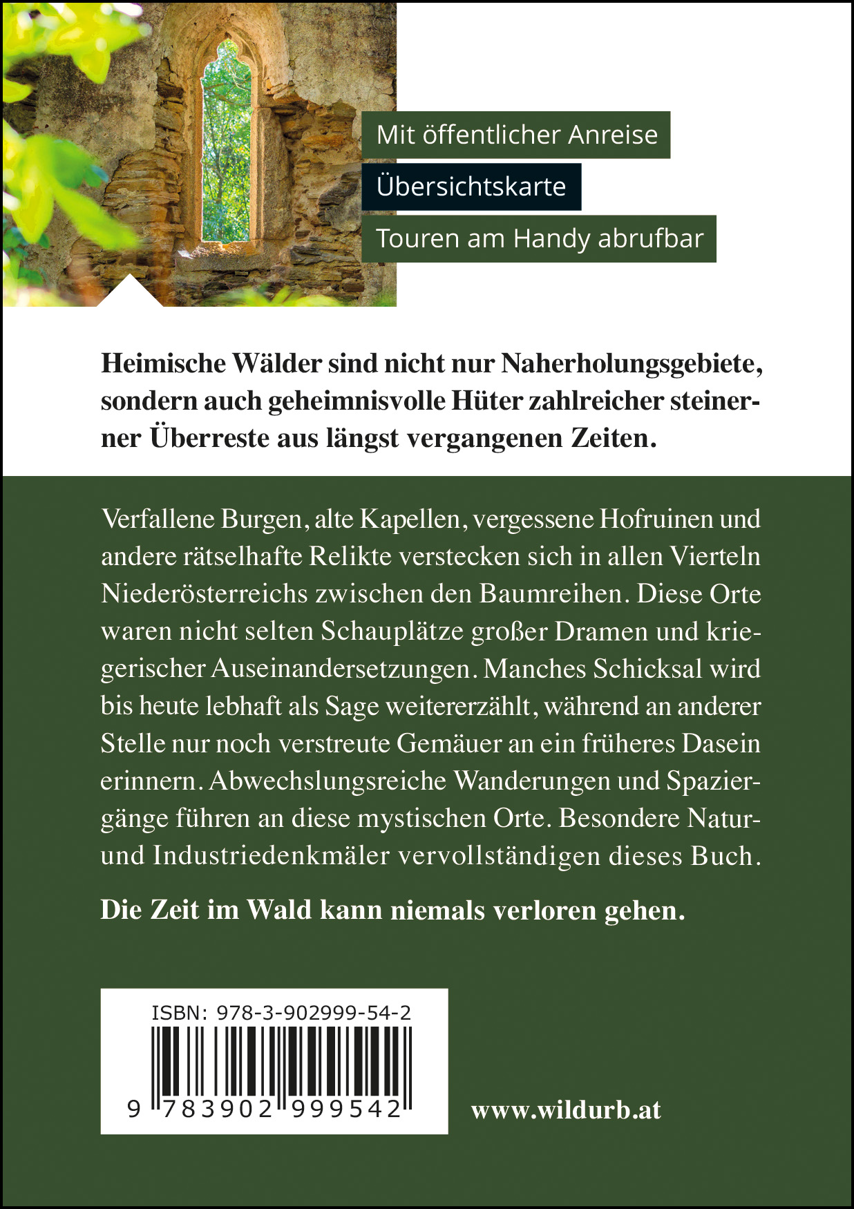 Heimische Wälder sind nicht nur Naherholungsgebiete, sondern auch geheimnisvolle Hüter zahlreicher steinerner Überreste aus längst vergangenen Zeiten.Verfallene Burgen, alte Kapellen, vergessene Hofruinen und andere rätselhafte Relikte verstecken sich in allen Vierteln Niederösterreichs zwischen den Baumreihen. Diese Orte waren nicht selten Schauplätze großer Dramen und kriegerischer Auseinandersetzungen. Manches Schicksal wird bis heute lebhaft als Sage weitererzählt, während an anderer Stelle nur noch verstreute Gemäuer an ein früheres Dasein erinnern. Abwechslungsreiche Wanderungen und Spaziergänge führen an diese mystischen Orte. Besondere Natur- und Industriedenkmäler vervollständigen dieses Buch.Die Zeit im Wald kann niemals verloren gehen.