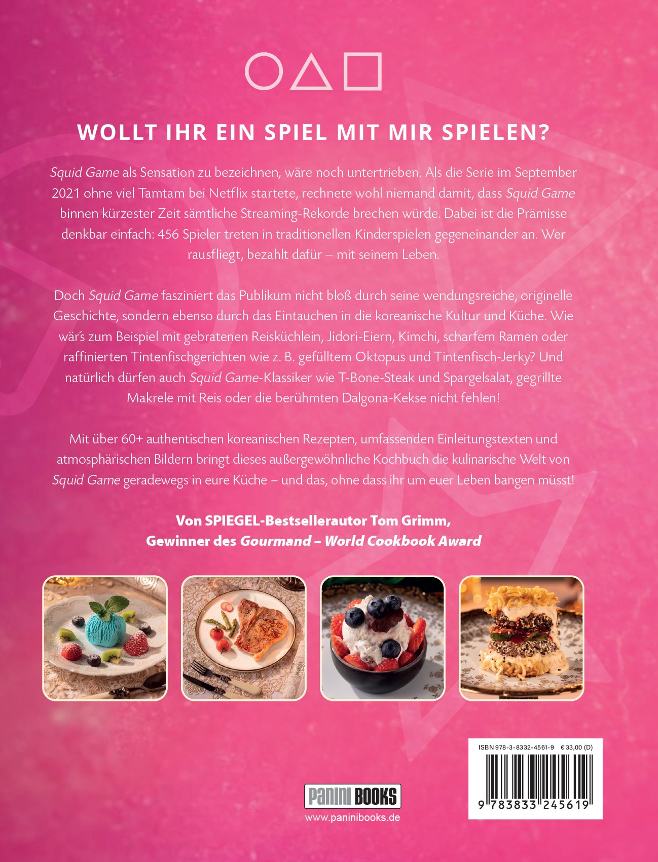 WOLLT IHR EIN SPIEL MIT MIR SPIELEN? Squid Game als Sensation zu bezeichnen, wäre noch untertrieben. Als die Serie im September 2021 ohne viel Tamtam bei Netflix startete, rechnete wohl niemand damit, dass Squid Game binnen kürzester Zeit sämtliche Streaming-Rekorde brechen würde. Dabei ist die Prämisse denkbar einfach: 456 Spieler treten in traditionellen Kinderspielen gegeneinander an. Wer rausfliegt, bezahlt dafür - mit seinem Leben. Doch Squid Game fasziniert das Publikum nicht bloß durch seine wendungsreiche, originelle Geschichte, sondern ebenso durch das Eintauchen in die koreanische Kultur und Küche. Wie wär´s zum Beispiel mit gebratenen Reisküchlein, Jidori-Eiern, Kimchi, scharfem Ramen oder raffinierten Tintenfischgerichten wie z. B. gefülltem Oktopus und Tintenfisch-Jerky? Und natürlich dürfen auch Squid Game-Klassiker wie T-Bone-Steak und Spargelsalat, gegrillte Makrele mit Reis oder die berühmten Dalgona-Kekse nicht fehlen! Mit über 60+ authentischen koreanischen Rezepten, umfassenden Einleitungstexten und atmosphärischen Bildern bringt dieses außergewöhnliche Kochbuch die kulinarische Welt von Squid Game geradewegs in eure Küche - und das, ohne dass ihr um euer Leben bangen müsst! Von SPIEGEL-Bestsellerautor Tom Grimm, Gewinner des Gourmand - World Cookbook Award