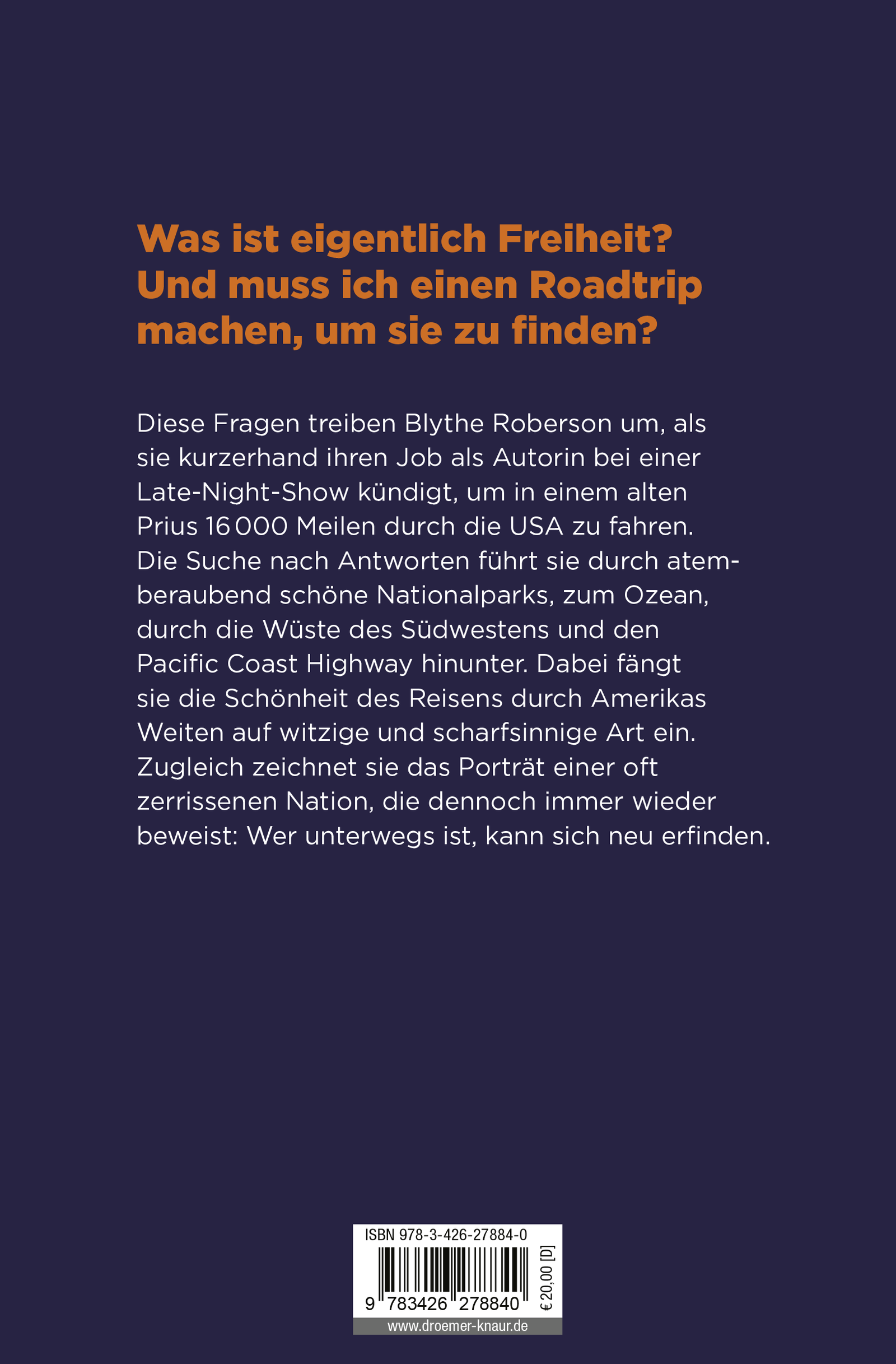 Als Blythe Roberson ihren Job bei einer Late-Night-Show kündigt, um in einem alten Prius 16.000 Meilen durch die USA zu fahren und mehrere Dutzend atemberaubend schöne National-Parks zu bewandern, treibt sie vor allem eine Frage um: Was bedeutet eigentlich Freiheit und warum manifestiert sich unsere Sehnsucht danach ausgerechnet im Reisen? Warum brechen jedes Jahr Hunderttausende Touristen zum selben Roadtrip auf und machen dieselben klischeehaften Selfies für Instagram?