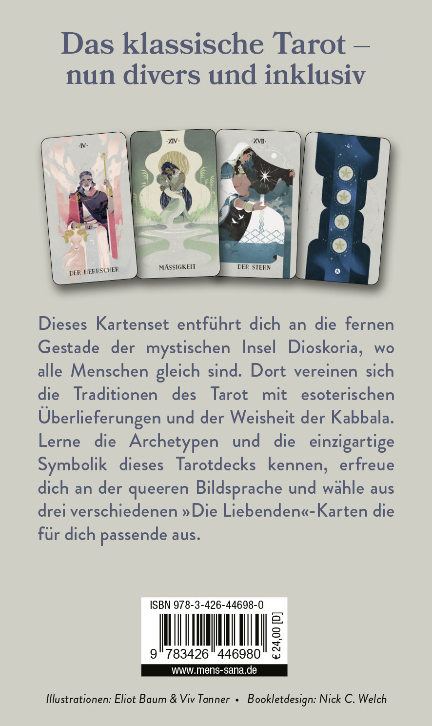 Dieses Tarotset hat außerdem eine ungewöhnliche Geschichte: Die Autor*innen und Illustrator*innen haben eine komplette Welt rund um ihr Tarot erschaffen, ein historisches Utopia, in dem das Werk sowohl einen räumlichen als auch einen zeitlichen Bezugsrahmen findet - angesiedelt in der fiktiven Welt von Dioskoria. Seit der Antike ist diese mysteriöse Insel ein Hafen für Mystiker*innen und Außenseiter*innen, Rebell*innen und Ausgestoßene, in der das Sefirot-Tarot als beliebtes Spiel, zum Nachdenken und Meditieren und als Tool für Wahrsagerei verwendet wurde.