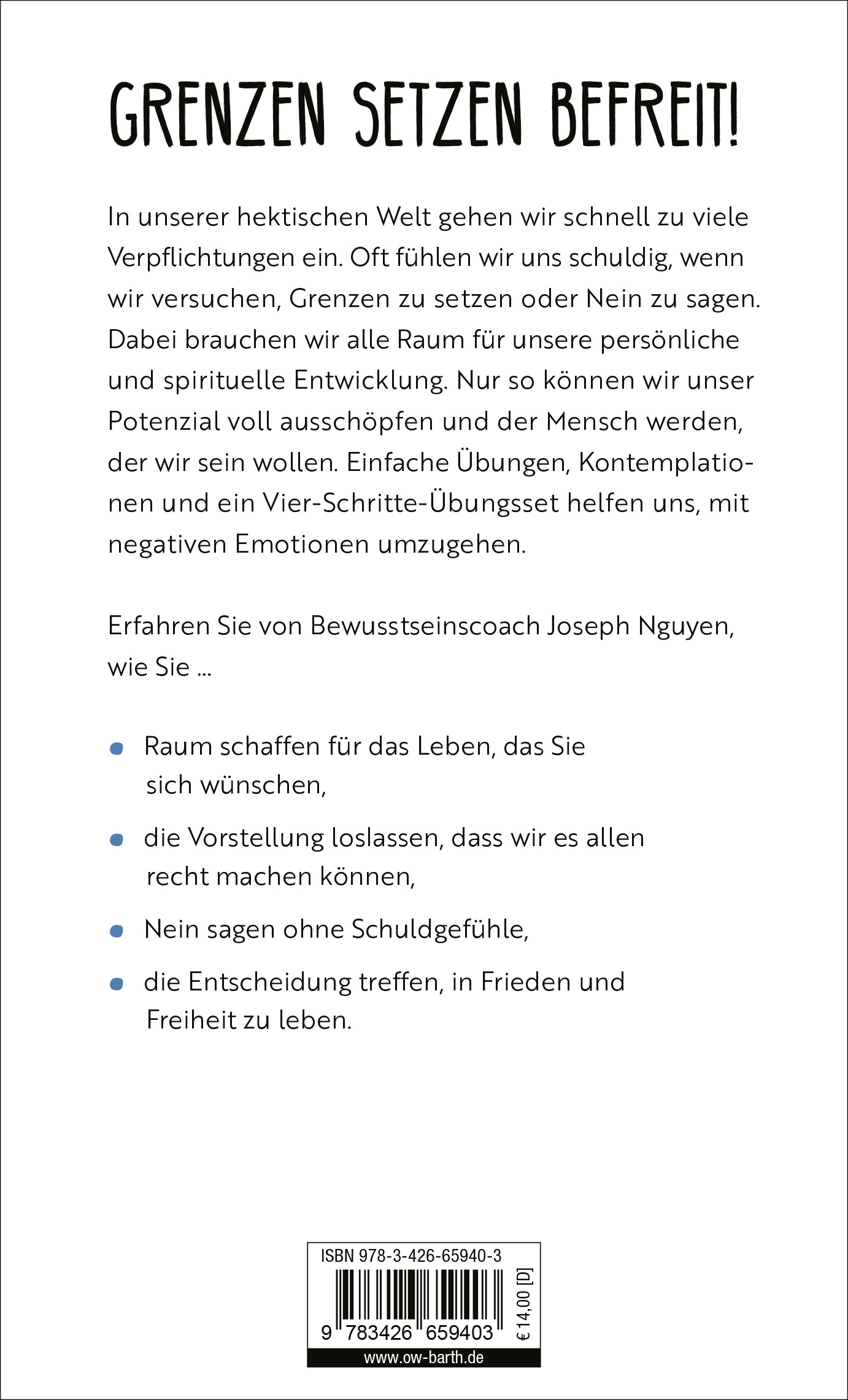 Der "kürzeste Ratgeber der Welt" zum Thema "Grenzen setzen": Bewusstseinscoach und Bestseller-Autor Joseph Nguyen zeigt auf nur 100 Seiten, wie wir anderen liebevoll und angemessen Grenzen setzen. Dabei helfen einfache Kontemplationen, Reflexions- und Schreibübungen Dabei helfen einfache Übungen, Kontemplationen und ein Vier-Schritte-Übungsset zum Umgang mit negativen Emotionen.