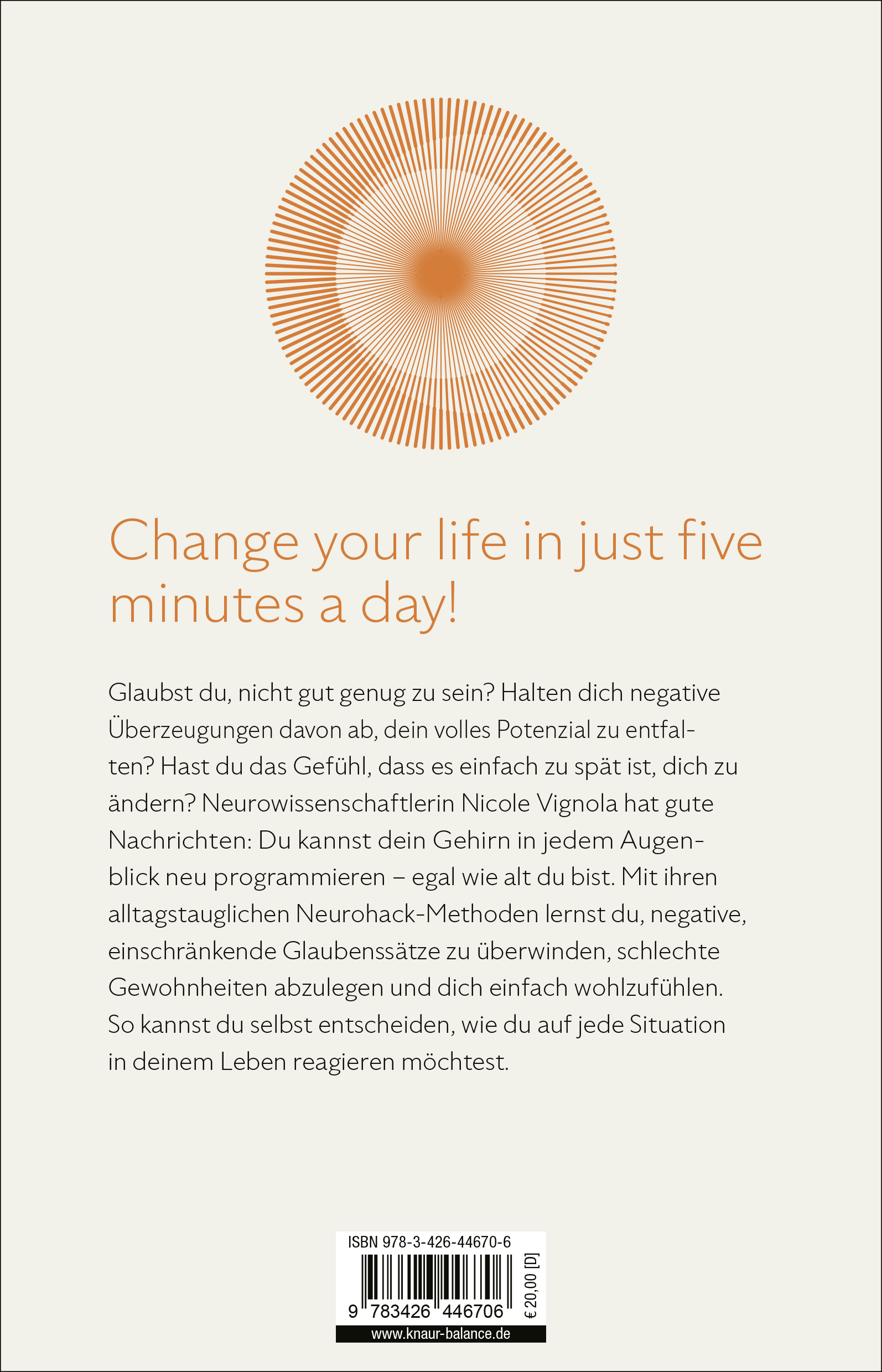 Wir alle haben Gewohnheiten und Verhaltensweisen, die uns davon abhalten, unser volles Potenzial auszuschöpfen. Neurowissenschaftlerin Nicole Vignola hat gute Nachrichten: Du kannst dein Gehirn in jedem Augenblick neu programmieren - egal, wie alt du bist. Indem du es neu vernetzt, kannst du dein Verhalten ändern und endlich die Person sein, die du schon immer sein wolltest - mithilfe der neuesten Erkenntnisse der Neurowissenschaften. Verständlich und anschaulich erläutert Vignola die Prinzipien der Neuroplastizität und vermittelt alltagstaugliche Neurohack-Methoden zur Änderung von Verhaltensmustern und Denkweisen.