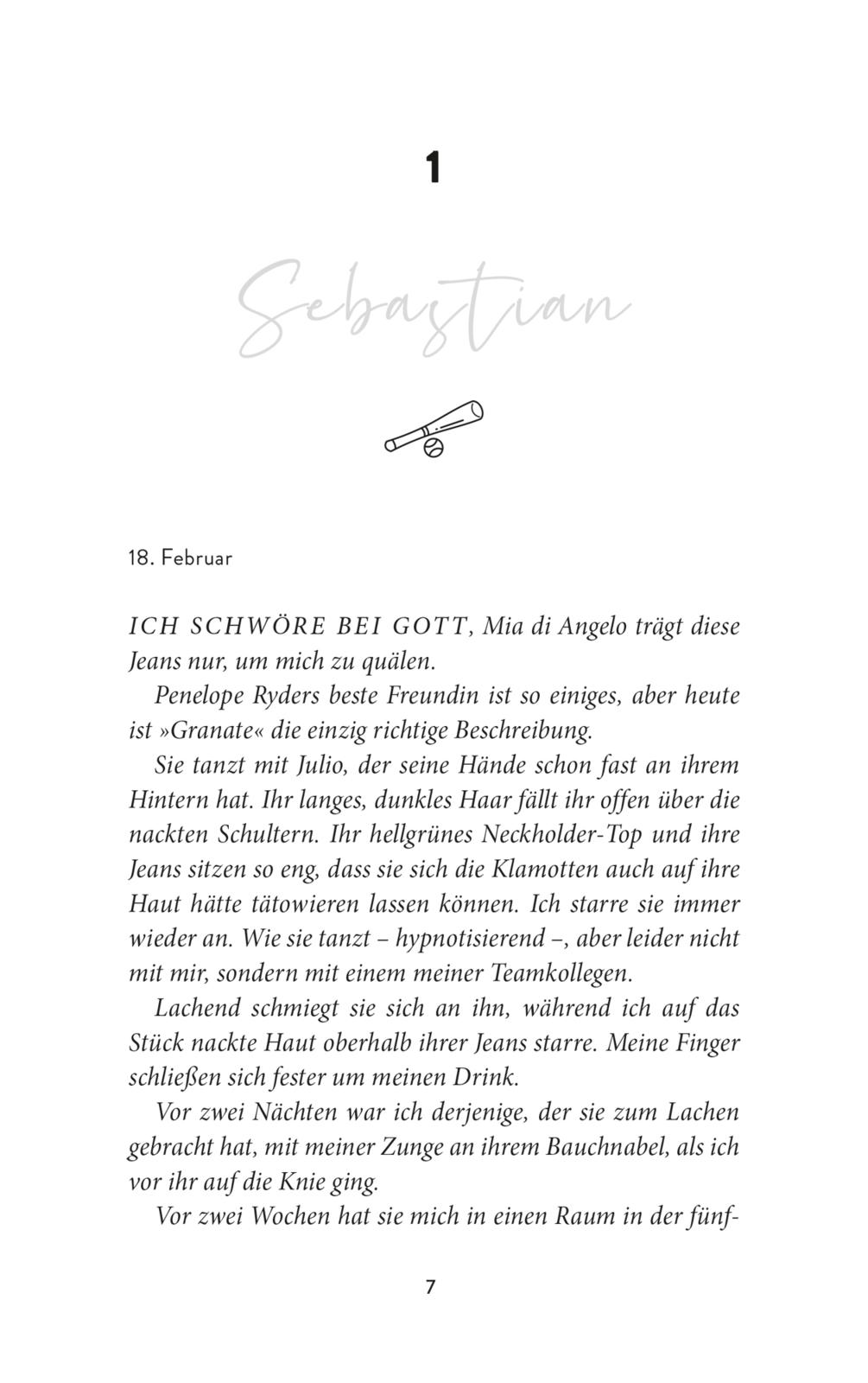 Diese Saison ist die entscheidende Gelegenheit, mich bei der Nachwuchsauswahl der großen Baseball-Teams zu beweisen. Das Letzte, was ich brauche, ist eine Ablenkung - erst recht nicht eine so verführerische wie Mia di Angelo. Die Astrophysikstudentin ist klug und umwerfend schön - natürlich musste ich mich verlieben. Doch als es zwischen uns ernster wurde, hat sie mich abserviert. Jap, autsch. Jetzt braucht sie allerdings eine Bleibe für den Sommer. Vergangenheit hin oder her ... bevor sie gar kein Alternative findet, sollte ich ihr wenigstens einmal anbieten bei mir einzuziehen.
