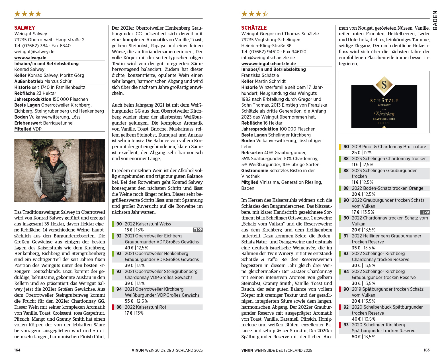 Einer der wichtigsten Begleiter für alle Weininteressierten, die sich über die aktuellen Entwicklungen in der deutschen Weinszene auf dem Laufenden halten möchten. Für die 8. Ausgabe des VINUM Weinguides hat das 30-köpfige Expertenteam um die Chefredakteure Matthias F. Mangold und Harald Scholl im Laufe des Jahres über 10.000 Weine der 1.000 besten Betriebe aus allen deutschen Anbaugebieten bewertet.