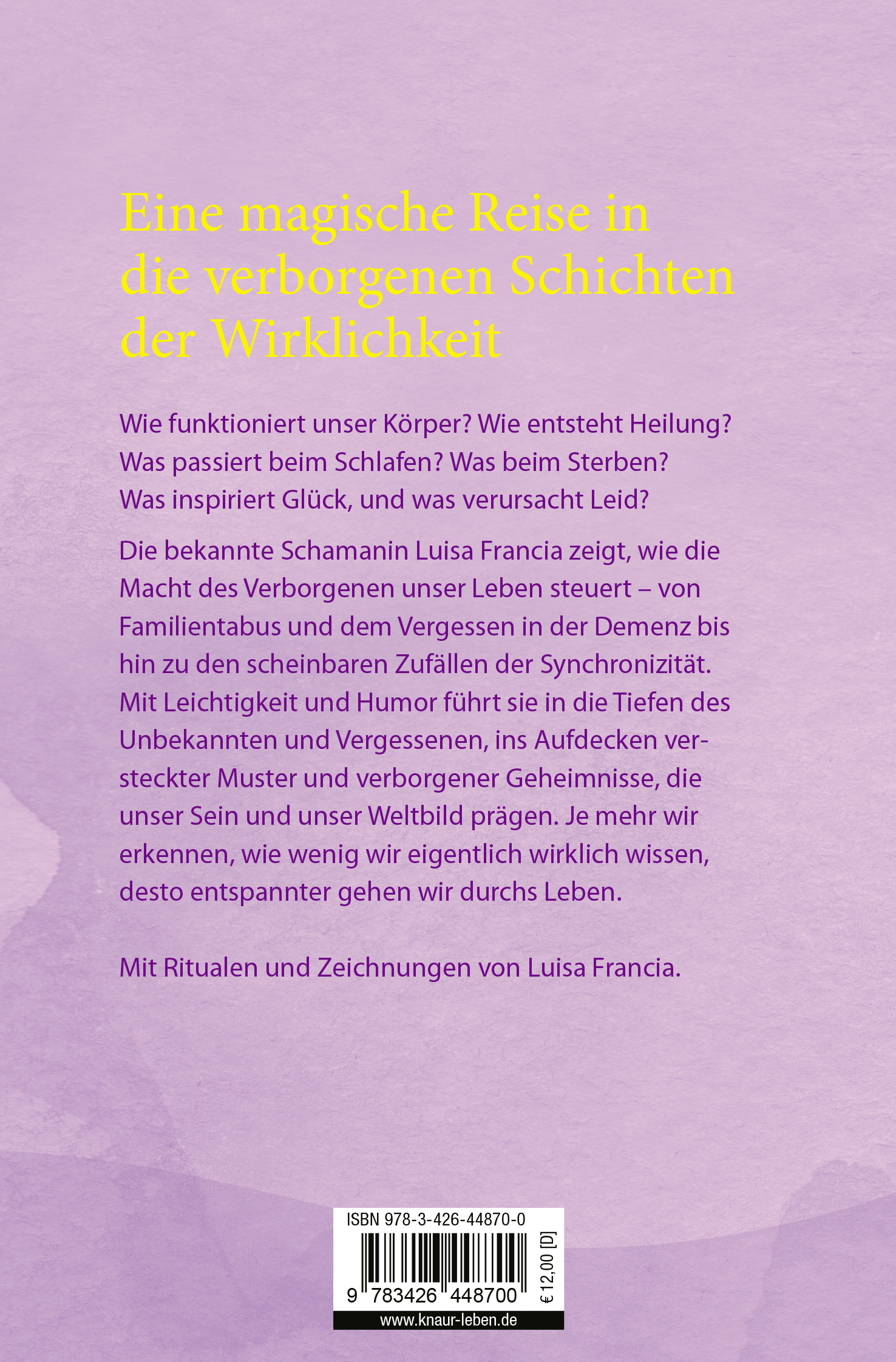 In ihrem neuen spirituellen Ratgeber wirft die bekannte Schamanin Luisa Francia Licht auf die verborgenen Schichten der Realität, von Familientabus und dem Vergessenen in der Demenz bis hin zu den scheinbaren Zufällen der Synchronizität. Mit Leichtigkeit und Humor führt sie uns in die spirituellen Tiefen des Unbekannten und Vergessenen, ins Aufdecken versteckter Muster und verborgener Geheimnisse, die unser Sein und unser Weltbild prägen.