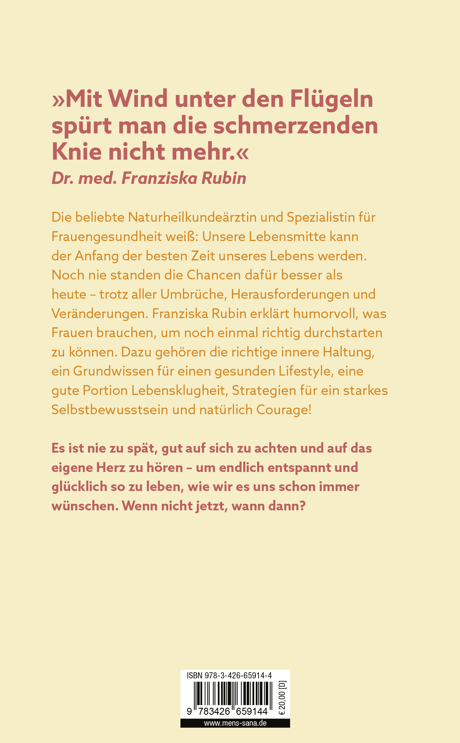 Die beliebte Ärztin und Spezialistin für Frauengesundheit weiß: Die Lebensmitte kann für Frauen zur besten Zeit ihres Lebens werden. Viele Frauen fühlen sich ausgebrannt: Die Kinder sind aus dem Haus, der Mann hat mit seiner eigenen Midlife-Crisis zu tun. Dazu kommen immer mehr Zipperlein. Was hat das Leben uns jetzt noch zu bieten? Jede Menge, meint die bekannte Bestsellerautorin Dr. med. Franziska Rubin. Sie weiß: