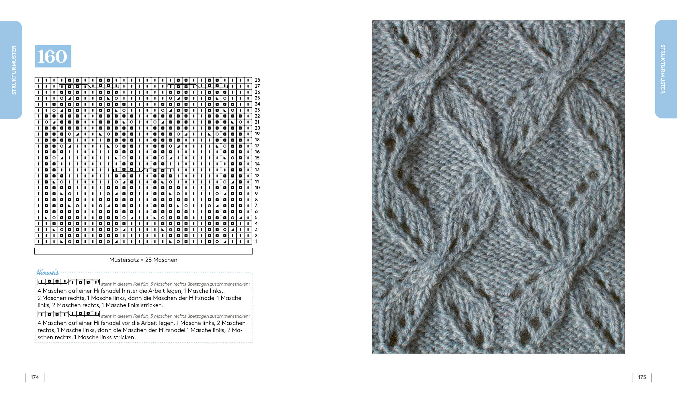 - 160 mehrfarbige Jaquard- und einfarbige Flecht- und Zopfmuster mit Detailfoto und Strickschrift