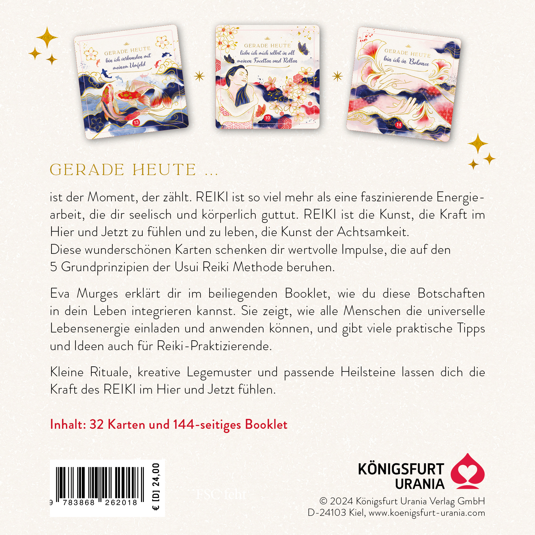 Gerade heute ...ist der Moment, der zählt. REIKI ist so viel mehr als eine faszinierende Energiearbeit, die dir seelisch und körperlich guttut. REIKI ist die Kunst, die Kraft im Hier und Jetzt zu fühlen und zu leben, die Kunst der Achtsamkeit.Diese wunderschönen Karten schenken dir wertvolle Impulse, die auf den 5 Grundprinzipien der Usui Reiki Methode beruhen. Eva Murges erklärt dir im beiliegenden Booklet, wie du diese Botschaften in dein Leben integrieren kannst. Sie zeigt, wie alle Menschen die universelle Lebensenergie einladen und anwenden können, und gibt viele praktische Tipps und Ideen auch für Reiki-Praktizierende. Kleine Rituale, kreative Legemuster und passende Heilsteine lassen dich die Kraft des REIKI im Hier und Jetzt fühlen.