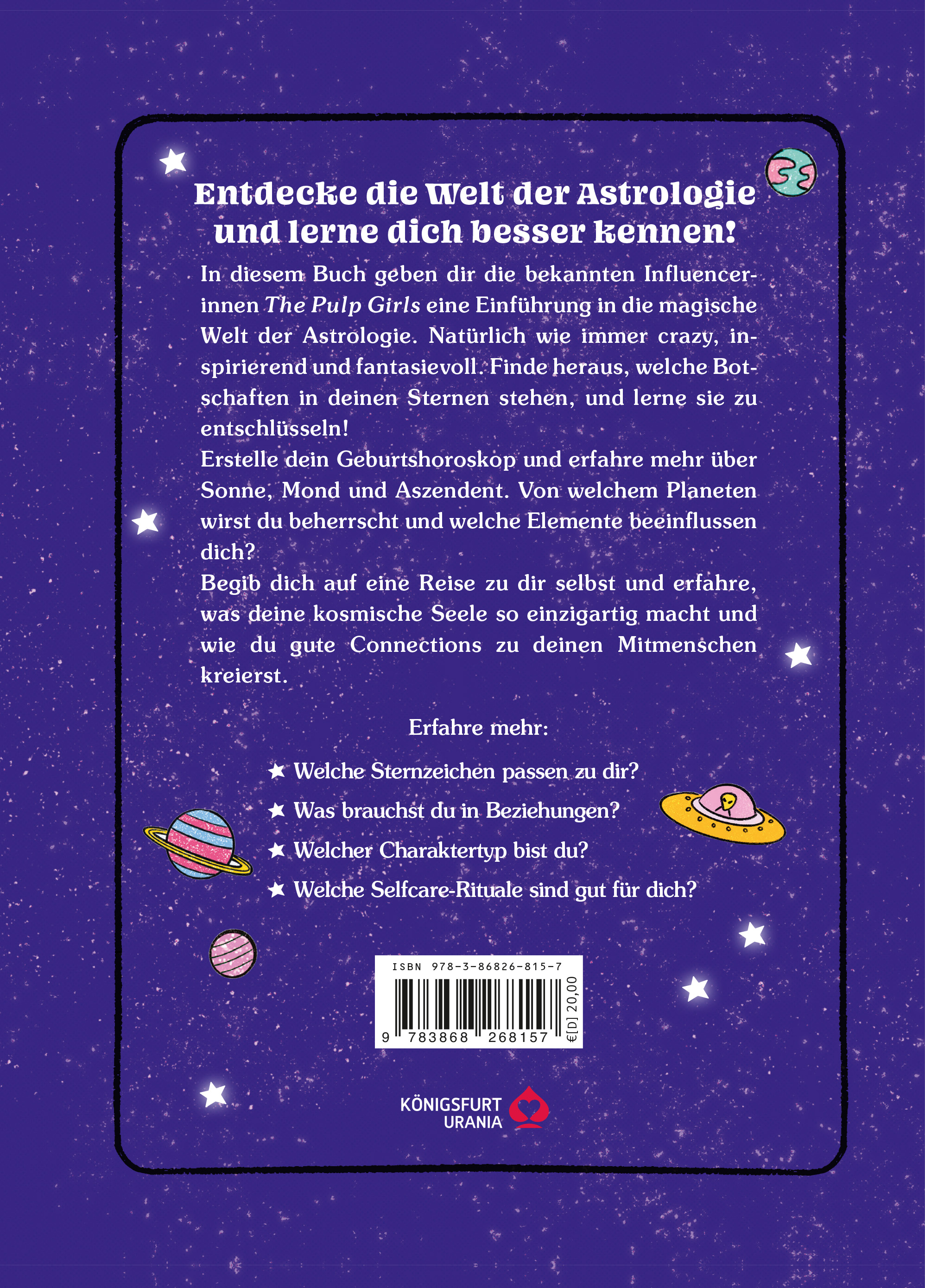 Entdecke die Welt der Astrologie und lerne dich besser kennen! In diesem Buch geben dir die bekannten Influencerinnen The Pulp Girls eine Einführung in die magische Welt der Astrologie. Natürlich wie immer crazy, inspirierend und fantasievoll. Finde heraus, welche Botschaften in deinen Sternen stehen, und lerne sie zu entschlüsseln!Erstelle dein Geburtshoroskop und erfahre mehr über Sonne, Mond und Aszendent. Von welchem Planeten wirst du beherrscht und welche Elemente beeinflussen dich? Begib dich auf eine Reise zu dir selbst und erfahre, was deine kosmische Seele so einzigartig macht und wie du gute Connections zu deinen Mitmenschen kreierst.Erfahre mehr:- Welche Sternzeichen passen zu dir?- Was brauchst du in Beziehungen?- Welcher Charaktertyp bist du?- Welche Selfcare-Rituale sind gut für dich?