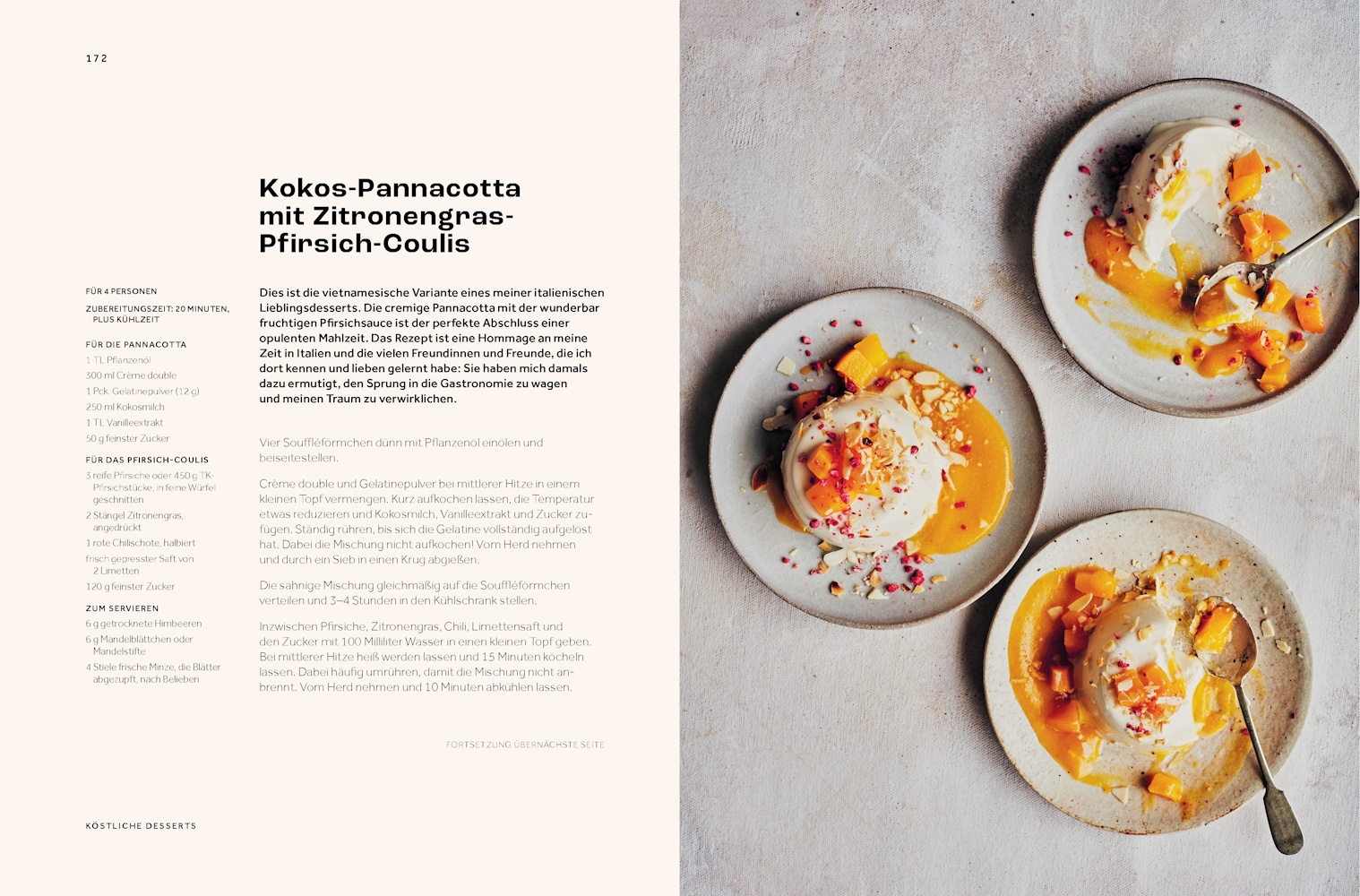 Süße Leckereien: Bananen-Tapioka-Kuchen mit Kokosnuss-Custard; Kokosnuss-Panna Cotta mit Zitronengras-Pfirsich-Coulis