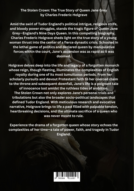 The Stolen Crown: The True Story of Queen Jane Greyby Charles Frederic HolgraveAmid the swirl of Tudor England's political intrigue, religious strife, and bloody power struggles, stands the tragic figure of Queen Jane Grey-England's Nine Days Queen. In this compelling biography, Charles Frederic Holgrave sheds light on the true story of a young woman thrust into the center of a fierce dynastic crisis. Schooled in the lethal game of politics and declared queen by manipulative forces within the court, Jane's ascension was as rapid as it was doomed.Holgrave delves deep into the life and legacy of a forgotten monarch whose reign, though fleeting, illuminates the complexities of English royalty during one of its most tumultuous periods. From her scholarly pursuits and devout Protestant faith to her coerced claim to the throne and subsequent downfall, Jane's life is a poignant tale of innocence lost amidst the ruthless tides of ambition.The Stolen Crown not only explores Jane's personal trials and tribulations but also the broader socio-political landscapes that defined Tudor England. With meticulous research and evocative narrative, Holgrave brings to life a past filled with palpable tension, heartbreaking decisions, and the ultimate sacrifice of a queen who was never meant to rule.Experience the drama of a forgotten queen whose story echoes the complexities of her time-a tale of power, faith, and tragedy in Tudor England.