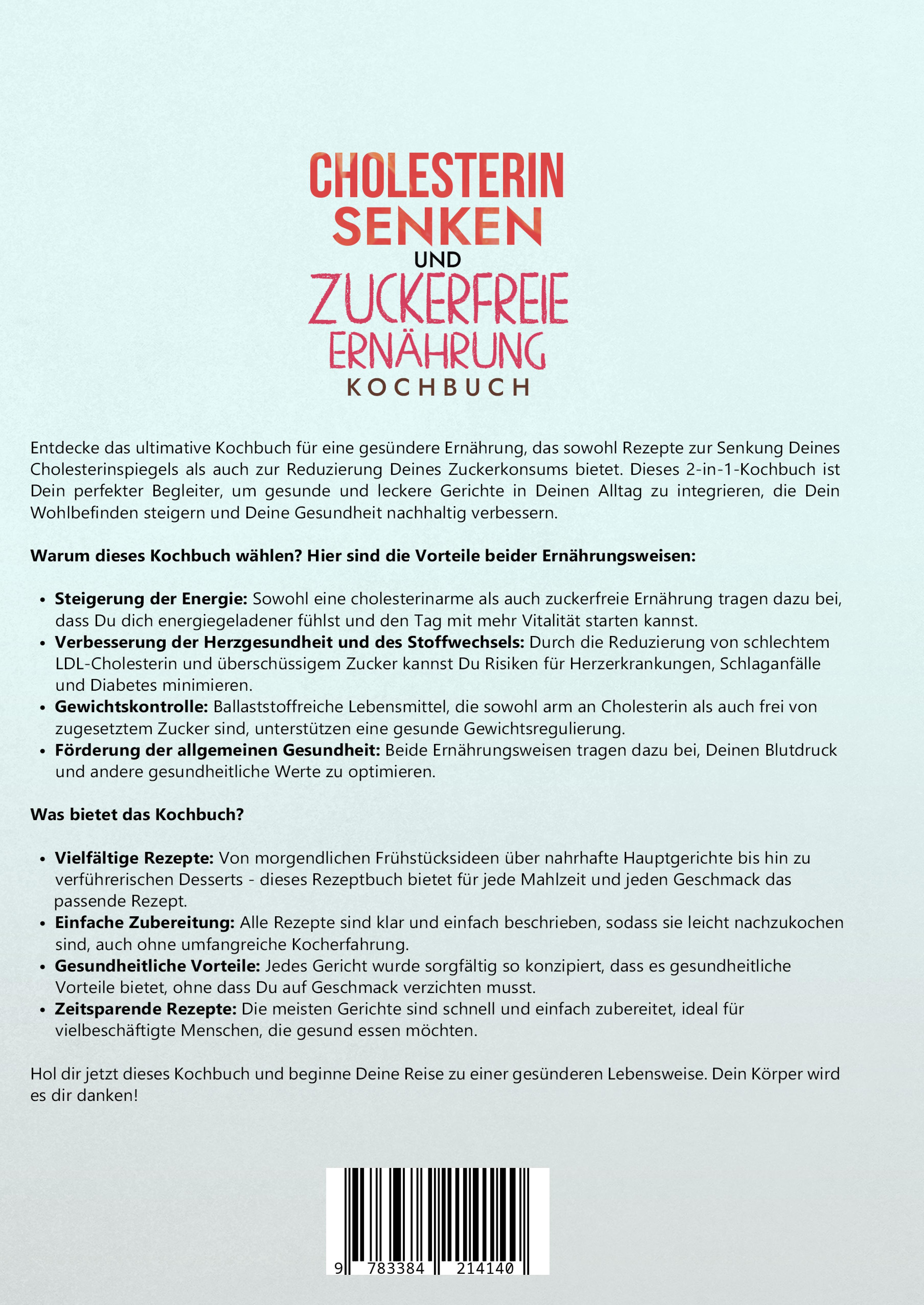 Entdecke das ultimative Kochbuch für eine gesündere Ernährung, das sowohl Rezepte zur Senkung Deines Cholesterinspiegels als auch zur Reduzierung Deines Zuckerkonsums bietet. Dieses 2-in-1-Kochbuch ist Dein perfekter Begleiter, um gesunde und leckere Gerichte in Deinen Alltag zu integrieren, die Dein Wohlbefinden steigern und Deine Gesundheit nachhaltig verbessern.Warum dieses Kochbuch wählen? Hier sind die Vorteile beider Ernährungsweisen:- Steigerung der Energie: Sowohl eine cholesterinarme als auch zuckerfreie Ernährung tragen dazu bei, dass Du dich energiegeladener fühlst und den Tag mit mehr Vitalität starten kannst.- Verbesserung der Herzgesundheit und des Stoffwechsels: Durch die Reduzierung von schlechtem LDL-Cholesterin und überschüssigem Zucker kannst Du Risiken für Herzerkrankungen, Schlaganfälle und Diabetes minimieren.- Gewichtskontrolle: Ballaststoffreiche Lebensmittel, die sowohl arm an Cholesterin als auch frei von zugesetztem Zucker sind, unterstützen eine gesunde Gewichtsregulierung.- Förderung der allgemeinen Gesundheit: Beide Ernährungsweisen tragen dazu bei, Deinen Blutdruck und andere gesundheitliche Werte zu optimieren.Was bietet das Kochbuch?- Vielfältige Rezepte: Von morgendlichen Frühstücksideen über nahrhafte Hauptgerichte bis hin zu verführerischen Desserts - dieses Rezeptbuch bietet für jede Mahlzeit und jeden Geschmack das passende Rezept.- Einfache Zubereitung: Alle Rezepte sind klar und einfach beschrieben, sodass sie leicht nachzukochen sind, auch ohne umfangreiche Kocherfahrung.- Gesundheitliche Vorteile: Jedes Gericht wurde sorgfältig so konzipiert, dass es gesundheitliche Vorteile bietet, ohne dass Du auf Geschmack verzichten musst.- Zeitsparende Rezepte: Die meisten Gerichte sind schnell und einfach zubereitet, ideal für vielbeschäftigte Menschen, die gesund essen möchten.Hol dir jetzt dieses Kochbuch und beginne Deine Reise zu einer gesünderen Lebensweise. Dein Körper wird es dir danken!