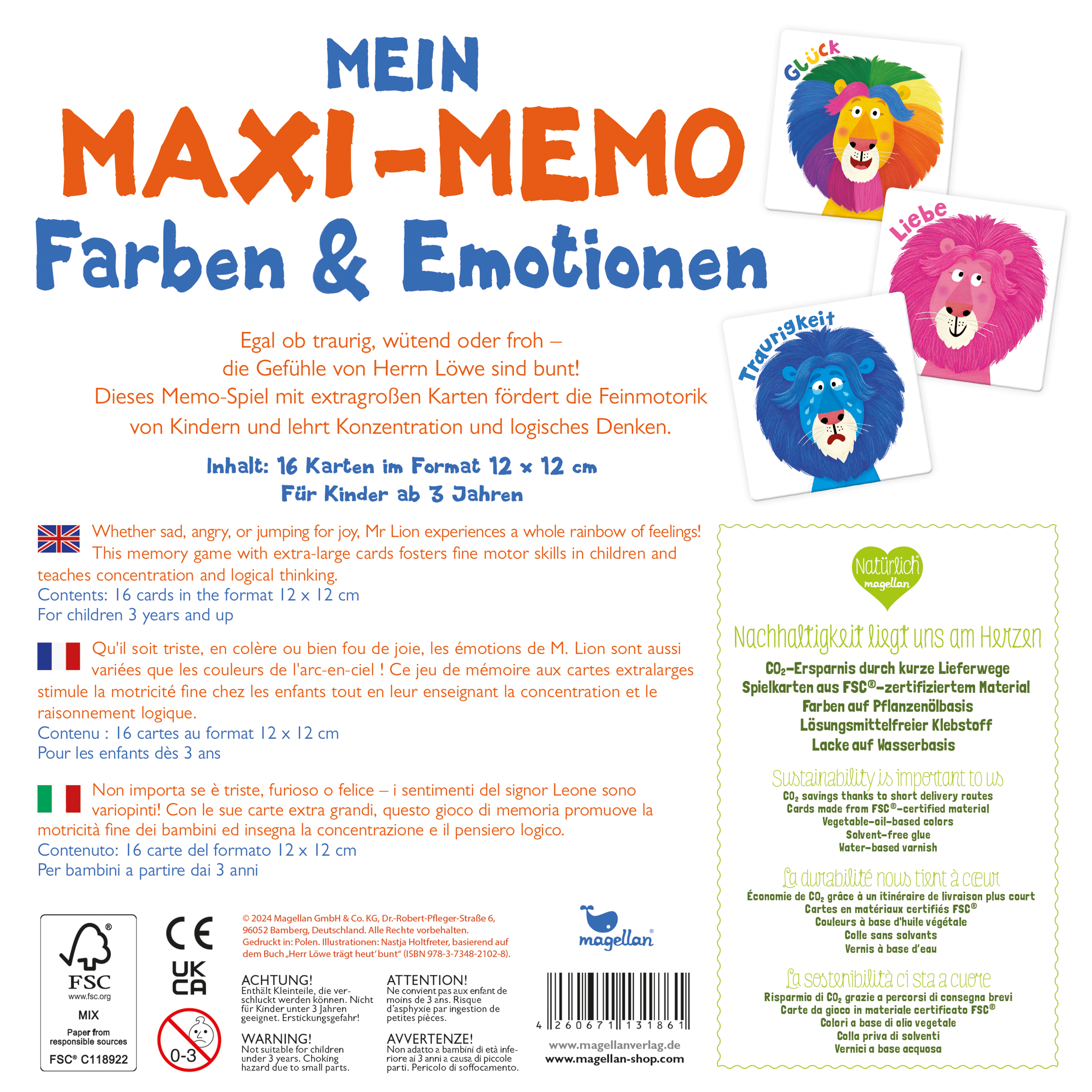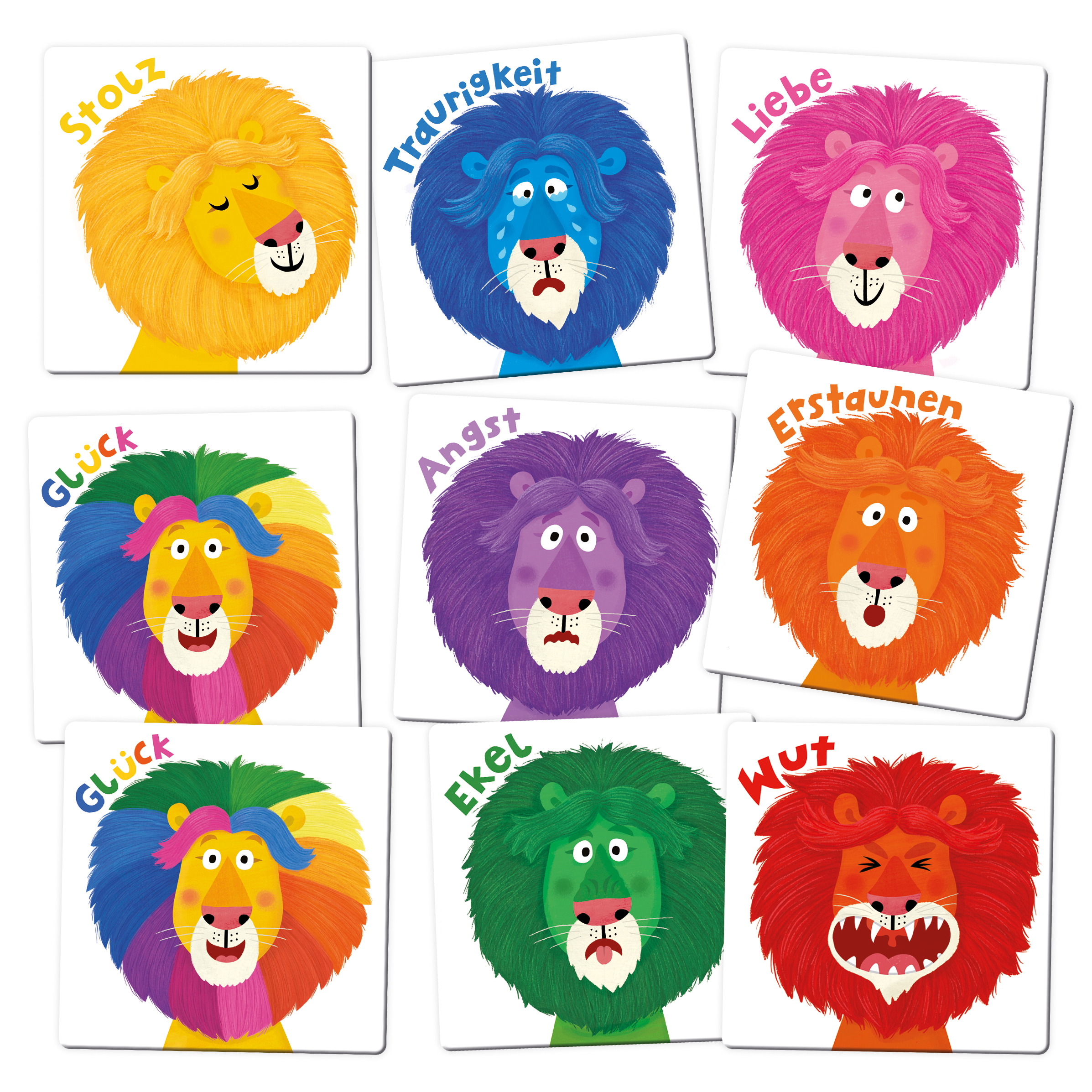 | Schlagworte | Bunt • Farben • Gedächtnisspiel • Gefühle • Glücklich • Herr Löwe trägt heut bunt • Legespiel • Lernspiel • Logik trainieren • Mitbringsel • Spieleklassiker • Traurig • Wut |
