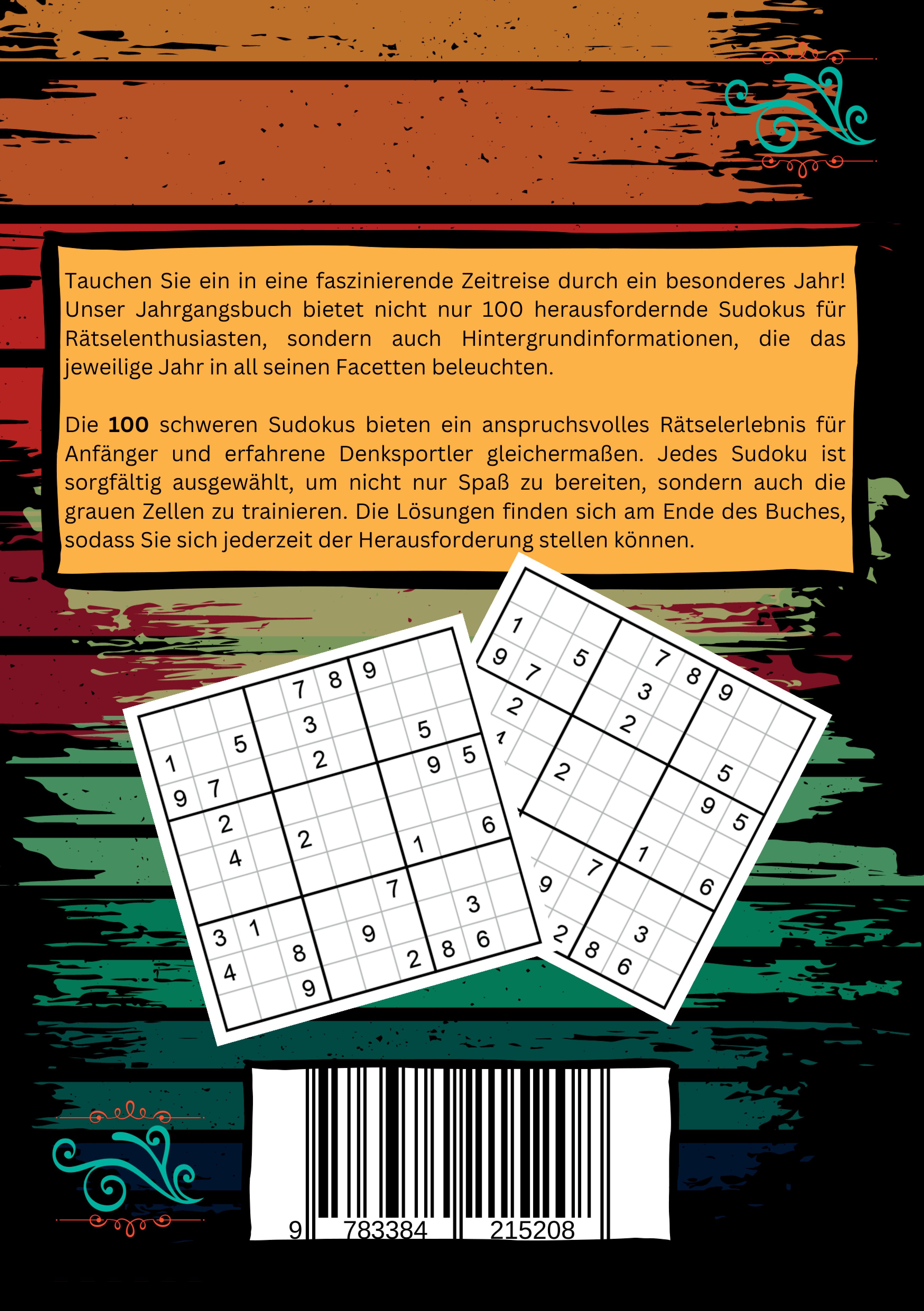 Tauchen Sie ein in eine faszinierende Zeitreise durch ein besonderes Jahr! Unser Jahrgangsbuch bietet nicht nur 100 herausfordernde Sudokus für Rätselenthusiasten, sondern auch Hintergrundinformationen, die das jeweilige Jahr in all seinen Facetten beleuchten. 100 schwere Sudokus bieten ein anspruchsvolles Rätselerlebnis für Anfänger und erfahrene Denksportler gleichermaßen. Jedes Sudoku ist sorgfältig ausgewählt, um nicht nur Spaß zu bereiten, sondern auch die grauen Zellen zu trainieren. Die Lösungen finden sich am Ende des Buches, sodass Sie sich jederzeit der Herausforderung stellen können.Doch dieses Buch ist mehr als nur ein Rätselspaß - es ist eine Zeitkapsel für Ihr gewähltes Jahr. Tauchen Sie ein in die historischen Ereignisse und kulturellen Meilensteine, die das Jahr geprägt haben. Von bedeutenden politischen Ereignissen über kulturelle Trends bis hin zu bewegenden sportlichen Geschichten - all diese Aspekte sind in unserem Jahrgangsbuch vereint."Das Jahrgangsbuch: Rätselspaß und Zeitreise" ist nicht nur eine Herausforderung für den Geist, sondern auch eine einzigartige Reise durch die Geschichte. Gönnen Sie sich selbst oder einem besonderen Menschen dieses einzigartige Geschenk, das Unterhaltung, Wissen und nostalgische Momente vereint.