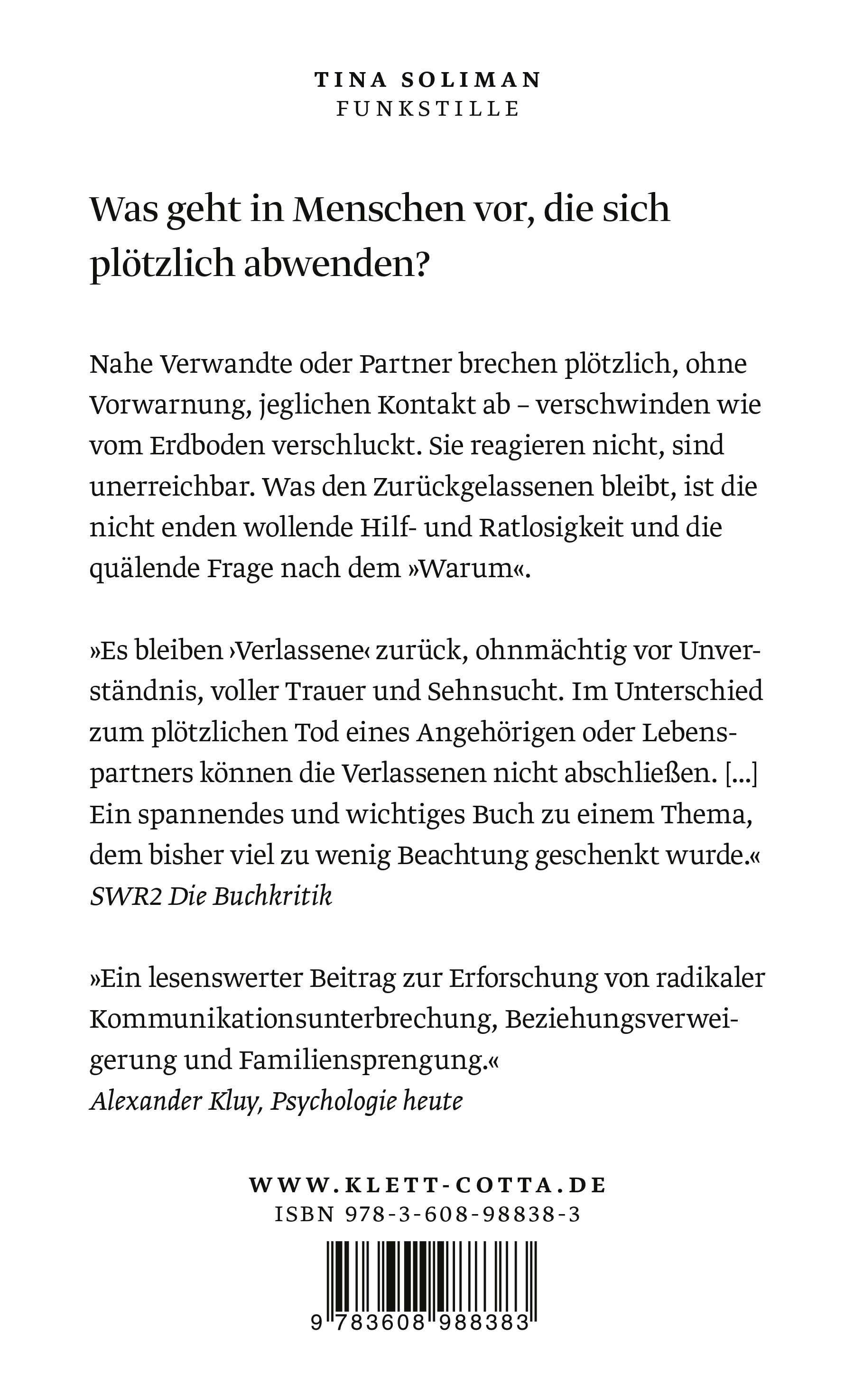 Nahe Verwandte oder Partner brechen plötzlich, ohne Vorwarnung, jeglichen Kontakt ab, sie reagieren nicht und sind unerreichbar. Was den Zurückgelassenen bleibt, ist nur die nicht enden wollende Hilf- und Ratlosigkeit und die quälende Frage nach dem Warum.