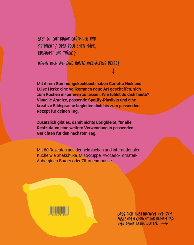 Zu einem gelungenen Gericht gehört nicht nur der gute Geschmack, sondern auch die passende Stimmung, die uns zu den Gerichten inspiriert. Denn jeder Tag ist geprägt von unterschiedlichen Eindrücken, Emotionen und Befindlichkeiten. Carlotta Hick und Luise Herke haben mit ihrem Stimmungskochbuch eine vollkommen neue Art geschaffen, sich zum Kochen inspirieren zu lassen. Visuelle Anreize, passende Spotify-Playlists und eine kreative Bildsprache begleiten dich bis zum passenden Rezept für deinen Tag.