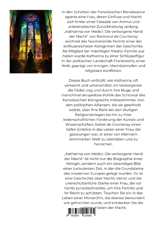 In den Schatten der französischen Renaissance agierte eine Frau, deren Einfluss und Macht sich hinter einer Fassade von Anmut und aristokratischer Zurückhaltung verbarg. "Katharina von Medici: Die verborgene Hand der Macht" von Raimond de Courtenay zeichnet das faszinierende Porträt einer der einflussreichsten Königinnen der Geschichte. Als Mitglied der mächtigen Medici-Familie aus Italien wurde Katharina zu einer Schlüsselfigur in der politischen Landschaft Frankreichs, einer Welt, geprägt von Intrigen, Machtkämpfen und religiösen Konflikten.Dieses Buch enthüllt, wie Katharina, oft verkannt und unterschätzt, im Verborgenen die Fäden zog und durch ihre kluge und manchmal skrupellose Politik das Schicksal des französischen Königreichs mitbestimmte. Von den politischen Allianzen, die sie geschickt webte, über ihre Rolle bei den blutigen Religionskriegen bis hin zu ihrer leidenschaftlichen Förderung der Künste und Wissenschaften, bietet de Courtenay einen tiefen Einblick in das Leben einer Frau, die gezwungen war, in einer von Männern dominierten Welt zu überleben und zu herrschen."Katharina von Medici: Die verborgene Hand der Macht" ist nicht nur die Biographie einer Königin, sondern auch ein lebendiges Bild einer turbulenten Zeit, in der die Grundsteine des modernen Europas gelegt wurden. Es ist eine Geschichte über Macht, Verrat und die unerschütterliche Stärke einer Frau, die vor nichts zurückschreckte, um ihre Familie und ihr Reich zu schützen. Tauchen Sie ein in das Leben einer Monarchin, die ebenso bewundert wie gefürchtet wurde, und entdecken Sie die wahren Kosten der Macht.