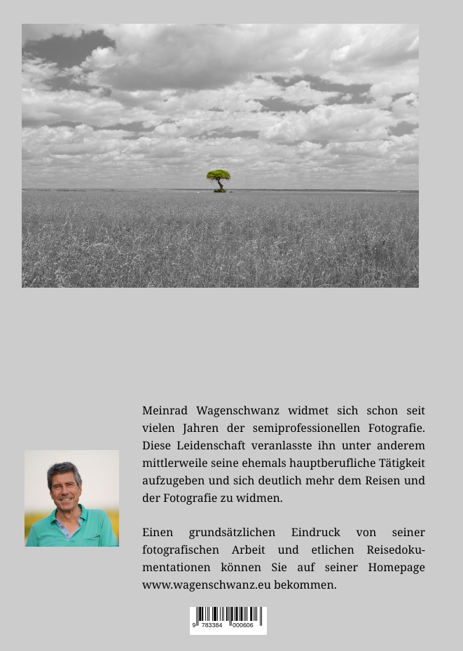 Meinrad Wagenschwanz widmet sich schon seit vielen Jahren der semiprofessionellen Fotografie. Diese Leidenschaft veranlasste ihn unter anderem seine ehemals hauptberufliche Tätigkeit aufzugeben und sich deutlich mehr dem Reisen und der Fotografie zu widmen. Beruflich verbrachte er mehrere Jahre in Kanada, England und der Schweiz. Seine Begeisterung für das Fotografieren und das Reisen begleiten ihn schon von seiner frühen Jugend an und so konnte er bisher bereits über 60 Länder der Erde bereisen. Einen Eindruck von seiner fotografischen Arbeit, etlichen Reisedokumentationen und seiner Vita können Sie auf seiner Homepage www.wagenschwanz.eu bekommen.