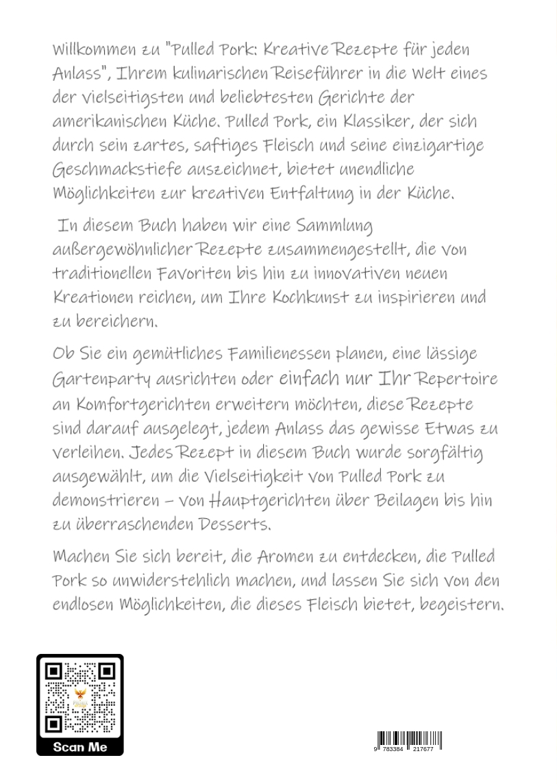 Dieses Kochbuch vereint kreative Rezepte für Pulled Pork und lädt dazu ein, sowohl kulinarische als auch kreative Fähigkeiten zu entdecken und zu entwickeln. Jedes Rezept wird durch detaillierte, thematisch passende Illustrationen begleitet die das Kocherlebnis visuell bereichern. Das Buch schafft eine einzigartige Verbindung zwischen Kochen und Kunst, wodurch es eine neue Dimension des Genusses eröffnet.