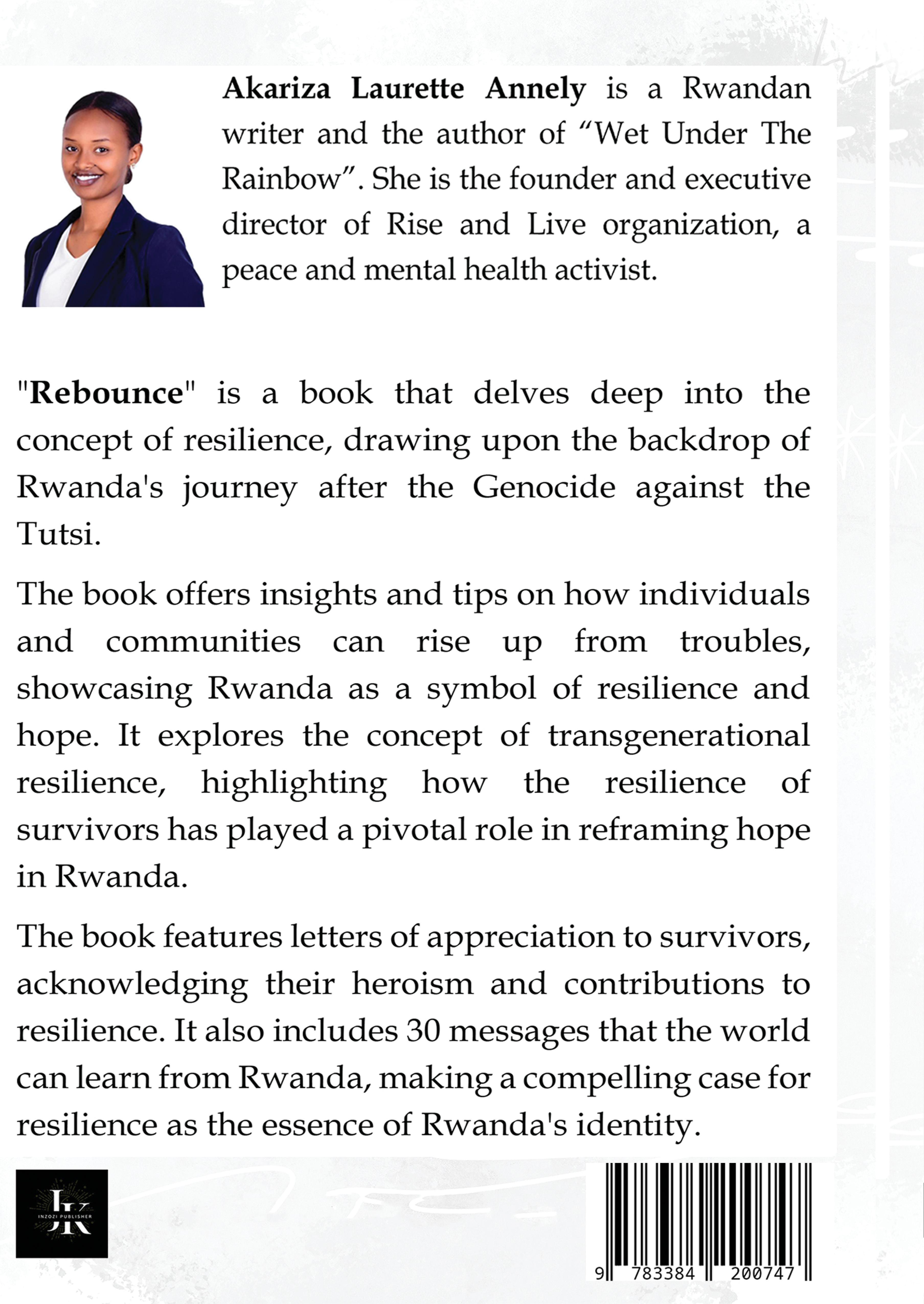 The main theme of "Rebounce" is resilience, particularly in the context of rising up from troubles. It focuses on transgenerational resilience, highlighting the journey of Rwanda after the Genocide against the Tutsi."Rebounce" delves deep into the concept of resilience, using Rwanda's journey after the Genocide against the Tutsi as a backdrop. It offers insights and tips on how individuals and communities can overcome challenges, showcasing Rwanda as a symbol of resilience and hope. The book explores transgenerational resilience, highlighting the role of survivors in reframing hope in Rwanda. It features letters of appreciation to survivors and includes 30 messages that the world can learn from Rwanda.