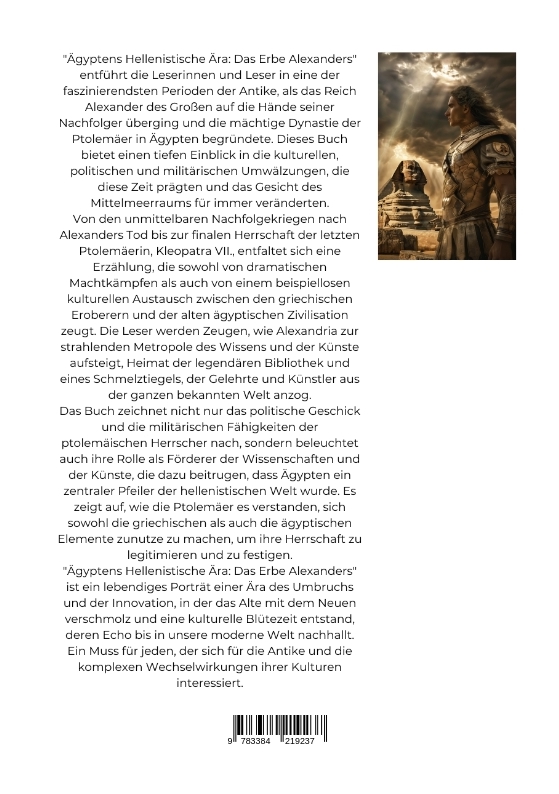 "Ägyptens Hellenistische Ära: Das Erbe Alexanders" entführt die Leserinnen und Leser in eine der faszinierendsten Perioden der Antike, als das Reich Alexander des Großen auf die Hände seiner Nachfolger überging und die mächtige Dynastie der Ptolemäer in Ägypten begründete. Dieses Buch bietet einen tiefen Einblick in die kulturellen, politischen und militärischen Umwälzungen, die diese Zeit prägten und das Gesicht des Mittelmeerraums für immer veränderten.Von den unmittelbaren Nachfolgekriegen nach Alexanders Tod bis zur finalen Herrschaft der letzten Ptolemäerin, Kleopatra VII., entfaltet sich eine Erzählung, die sowohl von dramatischen Machtkämpfen als auch von einem beispiellosen kulturellen Austausch zwischen den griechischen Eroberern und der alten ägyptischen Zivilisation zeugt. Die Leser werden Zeugen, wie Alexandria zur strahlenden Metropole des Wissens und der Künste aufsteigt, Heimat der legendären Bibliothek und eines Schmelztiegels, der Gelehrte und Künstler aus der ganzen bekannten Welt anzog.Das Buch zeichnet nicht nur das politische Geschick und die militärischen Fähigkeiten der ptolemäischen Herrscher nach, sondern beleuchtet auch ihre Rolle als Förderer der Wissenschaften und der Künste, die dazu beitrugen, dass Ägypten ein zentraler Pfeiler der hellenistischen Welt wurde. Es zeigt auf, wie die Ptolemäer es verstanden, sich sowohl die griechischen als auch die ägyptischen Elemente zunutze zu machen, um ihre Herrschaft zu legitimieren und zu festigen."Ägyptens Hellenistische Ära: Das Erbe Alexanders" ist ein lebendiges Porträt einer Ära des Umbruchs und der Innovation, in der das Alte mit dem Neuen verschmolz und eine kulturelle Blütezeit entstand, deren Echo bis in unsere moderne Welt nachhallt. Ein Muss für jeden, der sich für die Antike und die komplexen Wechselwirkungen ihrer Kulturen interessiert.