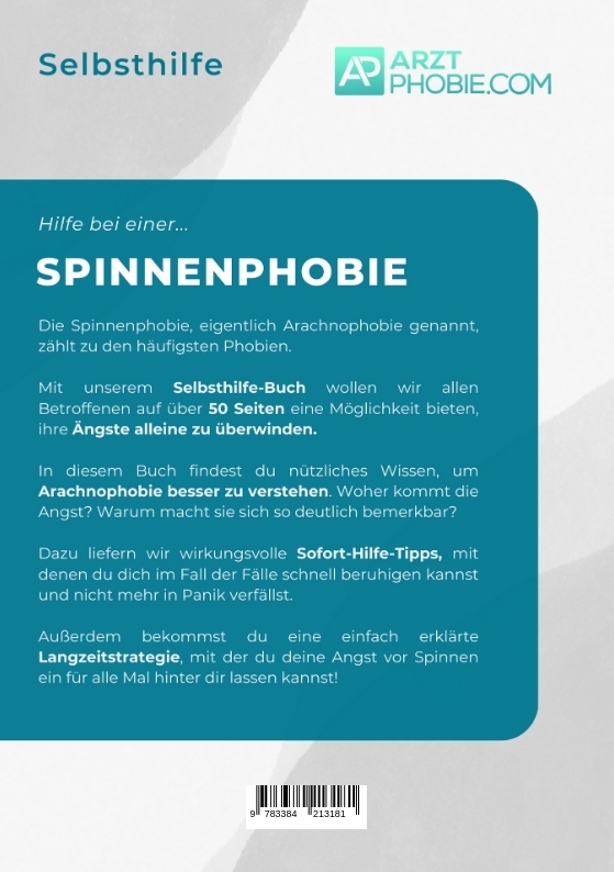 Mit diesem Selbsthilfe-Buch von Arztphobie.com wollen wir allen Betroffenen einer Spinnenphobie (Arachnophobie) auf über 50 Seiten eine Möglichkeit bieten, ihre Angst vor Spinnen allein zu überwinden. In diesem Buch findest du nützliches Wissen, um Arachnophobie besser zu verstehen. Woher kommt die Angst? Warum macht sie sich so deutlich bemerkbar?Dazu liefern wir wirkungsvolle Sofort-Hilfe-Tipps, mit denen du dich im Fall der Fälle schnell beruhigen kannst und nicht mehr in Panik verfällst. Außerdem bekommst du eine einfach erklärte Langzeitstrategie, mit der du deine Angst vor Spinnen ein für alle Mal hinter dir lassen kannst!