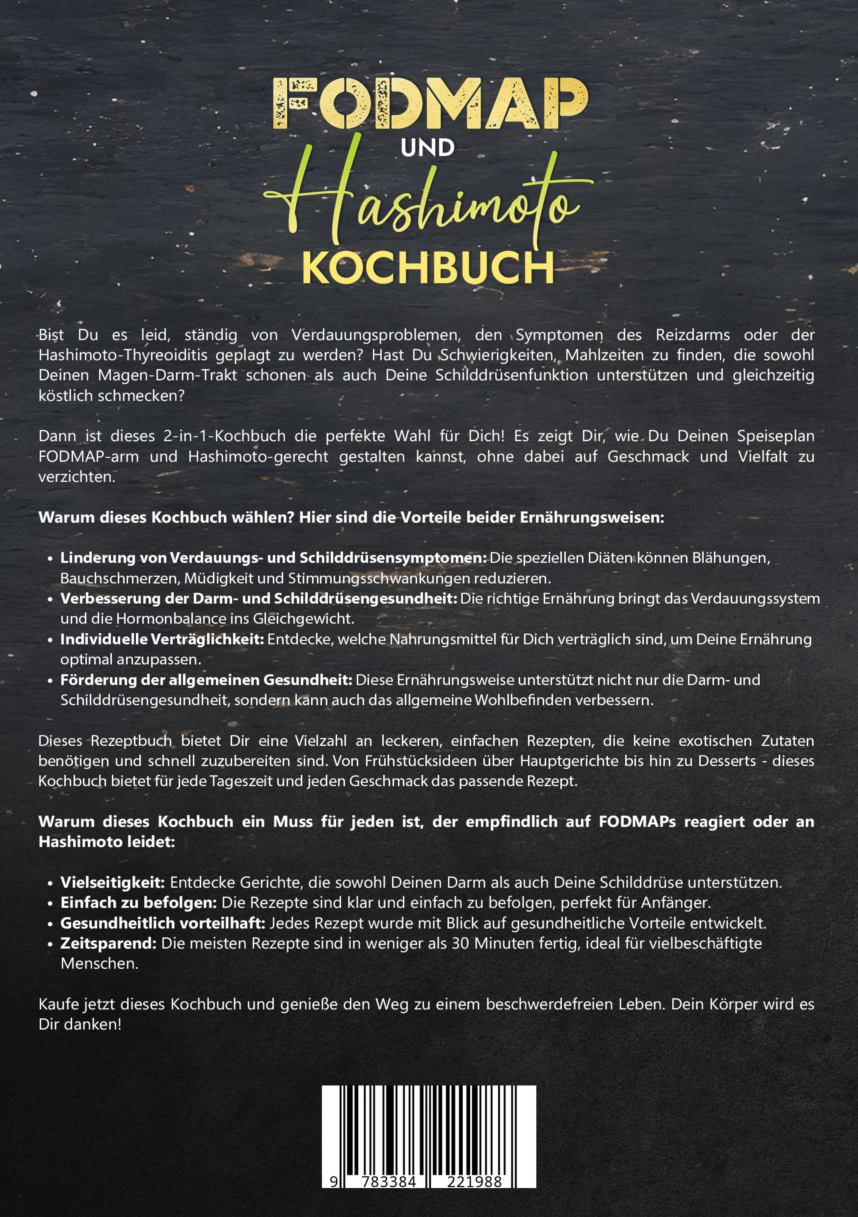 Bist Du es leid, ständig von Verdauungsproblemen, den Symptomen des Reizdarms oder der Hashimoto-Thyreoiditis geplagt zu werden? Hast Du Schwierigkeiten, Mahlzeiten zu finden, die sowohl Deinen Magen-Darm-Trakt schonen als auch Deine Schilddrüsenfunktion unterstützen und gleichzeitig köstlich schmecken?Dann ist dieses 2-in-1-Kochbuch die perfekte Wahl für Dich! Es zeigt Dir, wie Du Deinen Speiseplan FODMAP-arm und Hashimoto-gerecht gestalten kannst, ohne dabei auf Geschmack und Vielfalt zu verzichten.Warum dieses Kochbuch wählen? Hier sind die Vorteile beider Ernährungsweisen:- Linderung von Verdauungs- und Schilddrüsensymptomen: Die speziellen Diäten können Blähungen, Bauchschmerzen, Müdigkeit und Stimmungsschwankungen reduzieren.- Verbesserung der Darm- und Schilddrüsengesundheit: Die richtige Ernährung bringt das Verdauungssystem und die Hormonbalance ins Gleichgewicht.- Individuelle Verträglichkeit: Entdecke, welche Nahrungsmittel für Dich verträglich sind, um Deine Ernährung optimal anzupassen.- Förderung der allgemeinen Gesundheit: Diese Ernährungsweise unterstützt nicht nur die Darm- und Schilddrüsengesundheit, sondern kann auch das allgemeine Wohlbefinden verbessern.Dieses Rezeptbuch bietet Dir eine Vielzahl an leckeren, einfachen Rezepten, die keine exotischen Zutaten benötigen und schnell zuzubereiten sind. Von Frühstücksideen über Hauptgerichte bis hin zu Desserts - dieses Kochbuch bietet für jede Tageszeit und jeden Geschmack das passende Rezept.Warum dieses Kochbuch ein Muss für jeden ist, der empfindlich auf FODMAPs reagiert oder an Hashimoto leidet:- Vielseitigkeit: Entdecke Gerichte, die sowohl Deinen Darm als auch Deine Schilddrüse unterstützen.- Einfach zu befolgen: Die Rezepte sind klar und einfach zu befolgen, perfekt für Anfänger.- Gesundheitlich vorteilhaft: Jedes Rezept wurde mit Blick auf gesundheitliche Vorteile entwickelt.- Zeitsparend: Die meisten Rezepte sind in weniger als 30 Minuten fertig, ideal für vielbeschäftigte Menschen.Kaufe jetzt dieses Kochbuch und genieße den Weg zu einem beschwerdefreien Leben. Dein Körper wird es Dir danken!