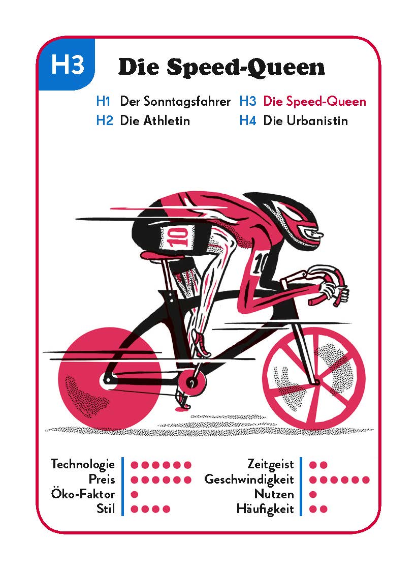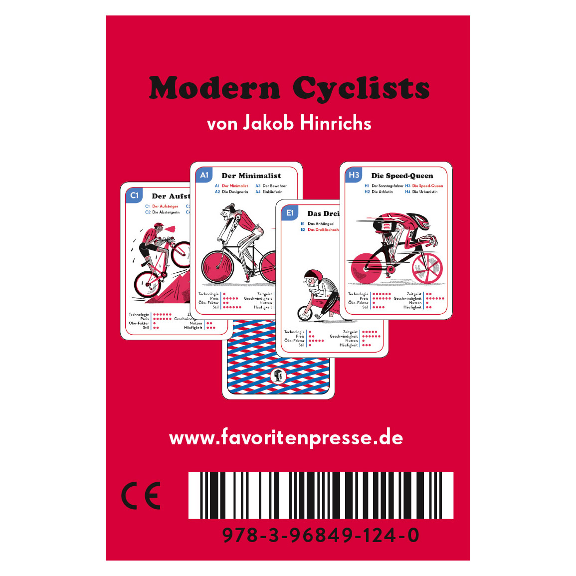 »Die Vielfalt der Fahrradkultur« bildet Jakob Hinrichs mit seinen Modern Cyclists ab. Und da jede*r Radler*in sehr individuell unterwegs ist, gibt es auch Haltungsnoten. Kategorien wie Öko-Faktor, Stil und Zeitgeist ergeben einen großen Spielespaß. Selbstverständlich ist es auch normales Quartett zu spielen.