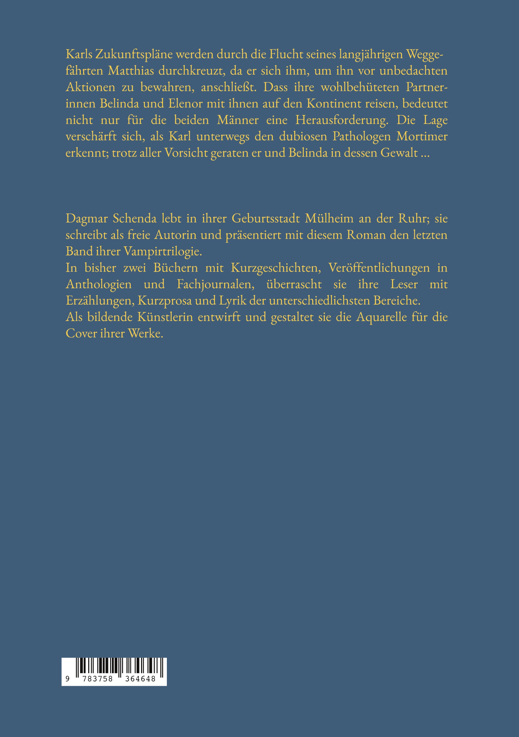 Spannung, Abenteuer und Gefahren - eine Reise ins Ungewisse!Karls Zukunftspläne werden durch die Flucht seines langjährigen Weggefährten Matthias durchkreuzt, dem er sich anschließt, um ihn vor unüberlegten Handlungen zu bewahren. Dass ihre wohlbehüteten Partnerinnen Belinda und Elenor mit auf den Kontinent reisen, ist nicht nur für die beiden Männer eine Herausforderung. Die Situation spitzt sich zu, als Karl unterwegs den zwielichtigen Pathologen Mortimer wiedererkennt und er und Belinda trotz aller Vorsicht in dessen Gewalt geraten...
