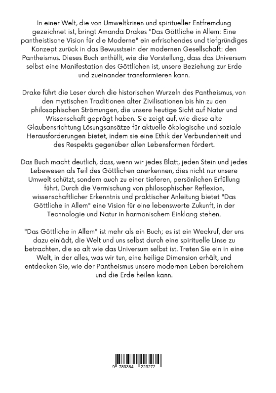 In einer Welt, die von Umweltkrisen und spiritueller Entfremdung gezeichnet ist, bringt Amanda Drakes "Das Göttliche in Allem: Eine pantheistische Vision für die Moderne" ein erfrischendes und tiefgründiges Konzept zurück in das Bewusstsein der modernen Gesellschaft: den Pantheismus. Dieses Buch enthüllt, wie die Vorstellung, dass das Universum selbst eine Manifestation des Göttlichen ist, unsere Beziehung zur Erde und zueinander transformieren kann.Drake führt die Leser durch die historischen Wurzeln des Pantheismus, von den mystischen Traditionen alter Zivilisationen bis hin zu den philosophischen Strömungen, die unsere heutige Sicht auf Natur und Wissenschaft geprägt haben. Sie zeigt auf, wie diese alte Glaubensrichtung Lösungsansätze für aktuelle ökologische und soziale Herausforderungen bietet, indem sie eine Ethik der Verbundenheit und des Respekts gegenüber allen Lebensformen fördert.Das Buch macht deutlich, dass, wenn wir jedes Blatt, jeden Stein und jedes Lebewesen als Teil des Göttlichen anerkennen, dies nicht nur unsere Umwelt schützt, sondern auch zu einer tieferen, persönlichen Erfüllung führt. Durch die Vermischung von philosophischer Reflexion, wissenschaftlicher Erkenntnis und praktischer Anleitung bietet "Das Göttliche in Allem" eine Vision für eine lebenswerte Zukunft, in der Technologie und Natur in harmonischem Einklang stehen."Das Göttliche in Allem" ist mehr als ein Buch; es ist ein Weckruf, der uns dazu einlädt, die Welt und uns selbst durch eine spirituelle Linse zu betrachten, die so alt wie das Universum selbst ist. Treten Sie ein in eine Welt, in der alles, was wir tun, eine heilige Dimension erhält, und entdecken Sie, wie der Pantheismus unsere modernen Leben bereichern und die Erde heilen kann.