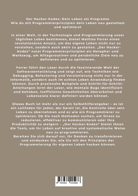 Der Hacker-Kodex: Dein Leben als ProgrammWie du mit Programmierprinzipien dein Leben neu gestaltest und optimierstIn einer Welt, in der Technologie und Programmierung unser tägliches Leben bestimmen, bietet Mathias Forrer einen revolutionären Ansatz, um das eigene Leben nicht nur zu verstehen, sondern auch aktiv zu gestalten. "Der Hacker-Kodex" nutzt Programmierprinzipien als Metapher und Werkzeug, um Alltagsroutinen und persönliche Ziele neu zu definieren und zu optimieren.Forrer führt den Leser durch die faszinierende Welt der Softwareentwicklung und zeigt auf, wie Techniken wie Debugging, Refactoring und Versionierung nicht nur in der Informatik, sondern auch im echten Leben Anwendung finden können. Durch praxisnahe Beispiele und Schritt-für-Schritt-Anleitungen lernt der Leser, wie mentale Bugs identifiziert und behoben, ineffiziente Gewohnheiten überarbeitet und Lebensziele klarer definiert werden können.Dieses Buch ist mehr als nur ein Selbsthilferatgeber - es ist ein Leitfaden für jeden, der bereit ist, die Kontrolle über sein Leben zu übernehmen und es wie ein Programmierer zu optimieren. Ob Sie nach Methoden suchen, um Stress zu reduzieren, effektiver zu kommunizieren oder Ihre Produktivität zu steigern - "Der Hacker-Kodex" bietet Ihnen die Tools, um Ihr Leben auf kreative und systematische Weise neu zu programmieren.Bereiten Sie sich darauf vor, Ihr Denken zu transformieren und entdecken Sie, wie Sie mit den Prinzipien der Programmierung Ihr eigenes Leben hacken können.