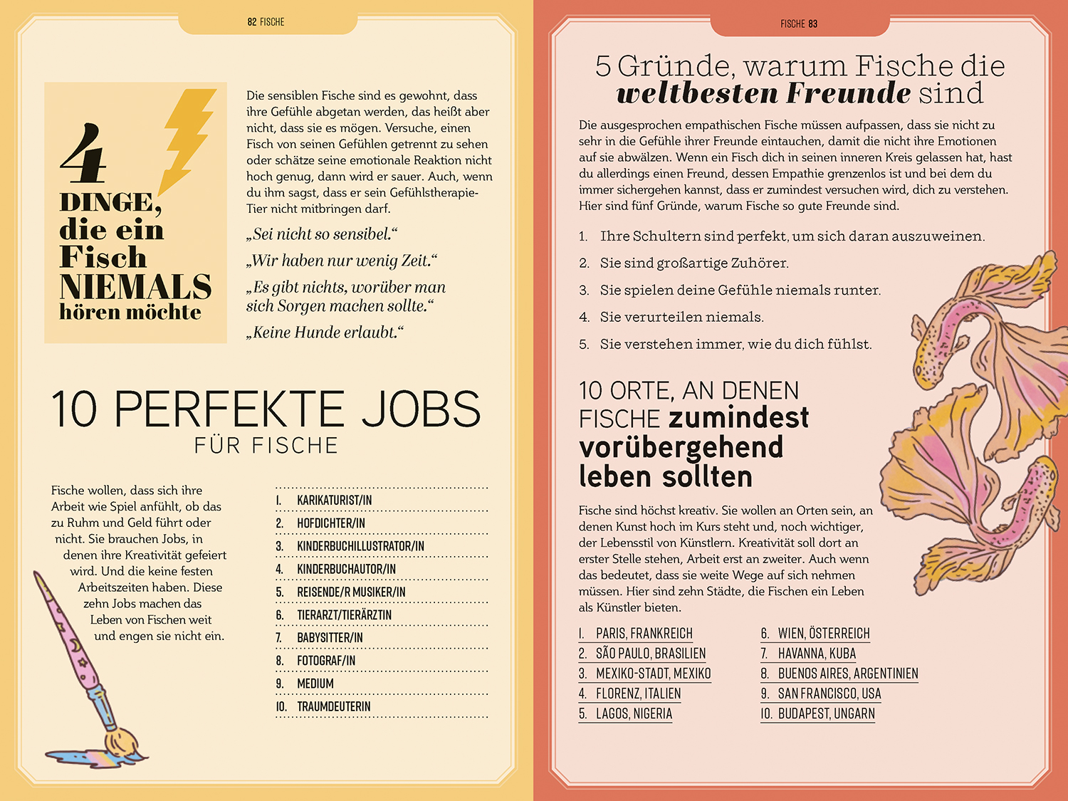 Ein humorvoller astrologischer Leitfaden für alle, die von Horoskopen besessen sind.In den Listen geht es nicht nur um einzelne Sternzeichen, vielmehr setzen sie alle Sternzeichen miteinander in Beziehung und vergleichen sie in einer Vielzahl von Themen, von schrullig bis herzlich. Ehrlich und knackig kurz werden die Sternzeichen miteinander verglichen, damit du einen umfassenden Überblick erhältst.Nach der Lektüre verstehst du dich selbst, deine Familie und deine Freunde besser. Wie tickt dein Chef? Wie sieht ein gelungenes Date mit einer Waage aus? Was solltest du einem Skorpion niemals sagen? Das und mehr wirst du erfahren, wenn du dieses wunderbar illustrierte Buch in die Hand nimmst, das ideal zum Teilen ist.