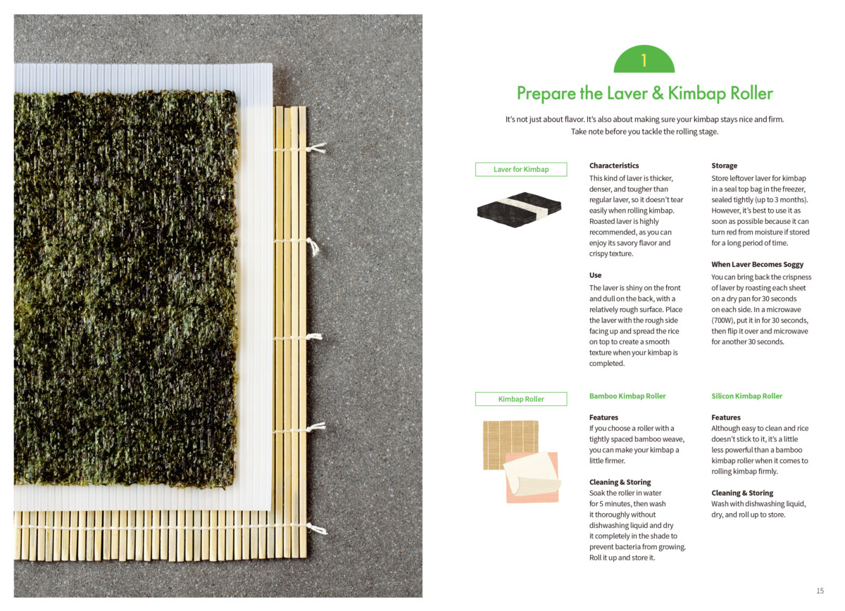 Basic Kimbap • Prepare the Laver & Kimbap Roller ••• 15 • Cooking Soft, Fluffy Rice ••• 16 • Seasoning the Cooked Rice ••• 20 • Combining Fillings ••• 22 • Prepare Delicious Fillings ••• 24 • Rolling & Rolling ••• 31 • Regular Kimbap ••• 32 • Premiun King Kimbap ••• 36 • Nude Kimbap ••• 38 • Egg Roll Kimbap ••• 40 • Water Drop Kimbap ••• 42 • Mini Kimbap ••• 44 • Square Kimbap ••• 44 • Neatly Slicing ••• 46 • Pack It Nicely ••• 47 Make It Extra Special • Enjoying Leftover Ingredients & Kimbap ••• 48