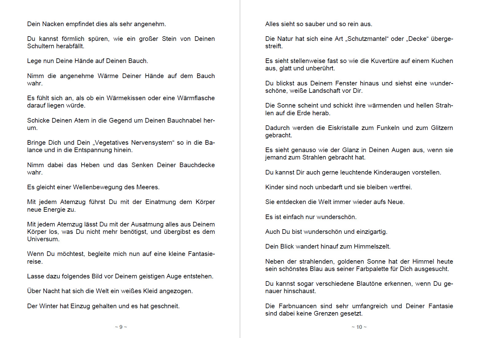 | Schlagworte | Autogenes Training • Blockaden lösen • Chakren Mediationen • Entpsannung für Frauen • Entspannen • entspanntes leben • Entspannung • entspannung für erwachsene • entspannung für frauen • entspannung für männer • entspannung geschenk • Entspannung lernen • Entspannungsgeschichten • Entspannungsreisen • Fantasiegeschichten • Fantasiereisen • Fantasiereisen für Erwachsene • Köper Geist Seele • Körperreisen • Lebensenergie • Mediationen • Mediationen für Erwachsene • Meditation • meditiere • Phantasiegeschichten • Progressive Muskelentspannung • Seele • sich entspannen • Visualisierungen • Yoga Nidra • zur Ruhe kommen |