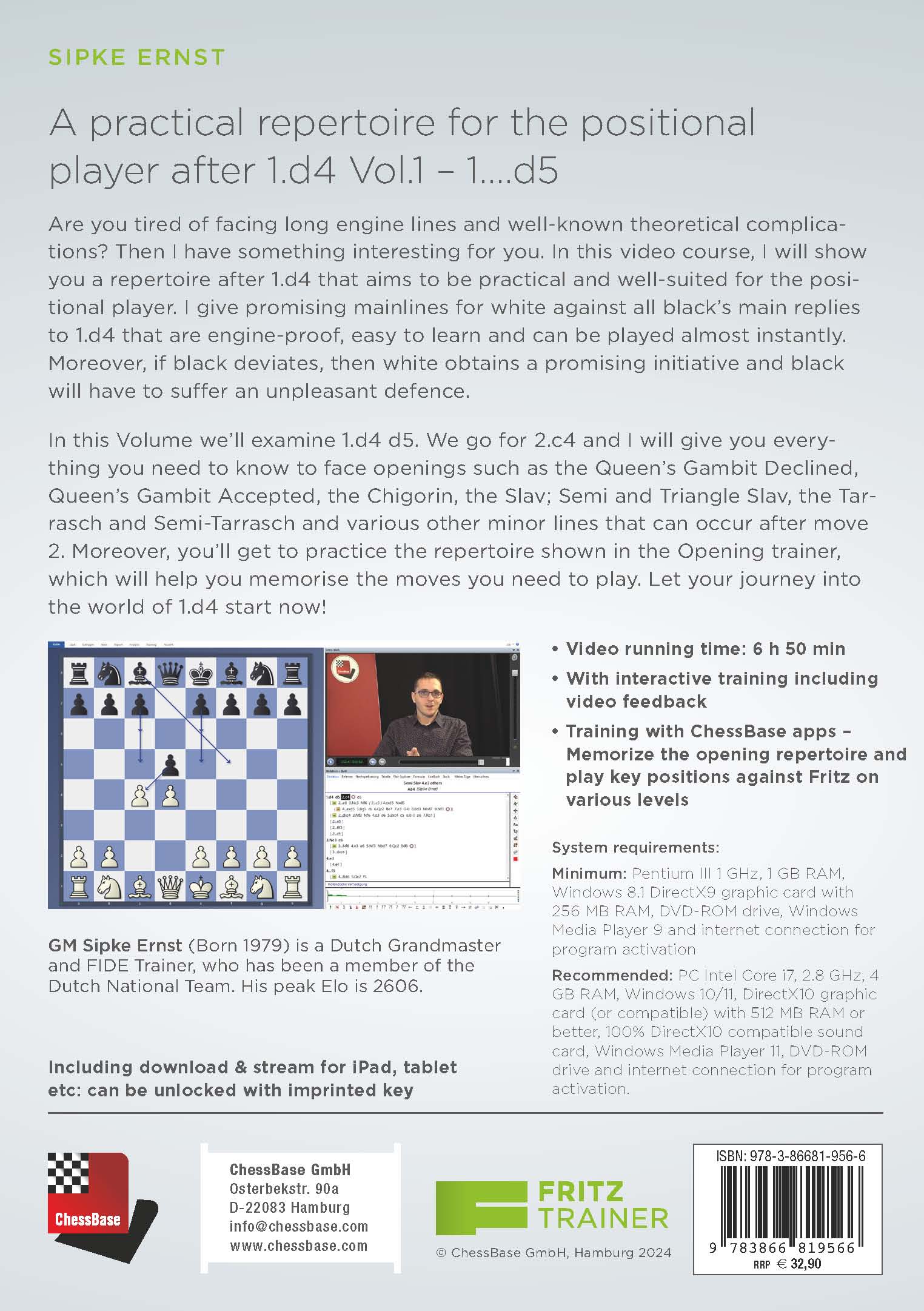 Are you tired of facing long engine lines and well-known theoretical complications? Then I have something interesting for you. In this video course, I will show you a repertoire after 1.d4 that aims to be practical and well-suited for the positional player. I give promising mainlines for white against all black's main replies to 1.d4 that are engine-proof, easy to learn and can be played almost instantly. Moreover, if black deviates, then white obtains a promising initiative and black will have to suffer an unpleasant defence.In this Volume we'll examine 1.d4 d5. We go for 2.c4 and I will give you everything you need to know to face openings such as the Queen's Gambit Declined, Queen's Gambit Accepted, the Chigorin, the Slav; Semi and Triangle Slav, the Tarrasch and Semi-Tarrasch and various other minor lines that can occur after move 2. Moreover, you'll get to practice the repertoire shown in the Opening trainer, which will help you memorise the moves you need to play. Let your journey into the world of 1.d4 start now!- Video running time: 6 h 50 min- With interactive training including video feedback- Training with Ches sBase apps - Memorize the opening repertoire and play key positions against Fritz on various levelsIncluding download & stream for iPad, tablet etc: can be unlocked with imprinted keySystem requirements: Minimum: Pentium III 1 GHz, 1 GB RAM, Windows 8.1 DirectX9 graphic card with 256 MB RAM, DVD-ROM drive, Windows Media Player 9 and internet connection for program activation. Recommended: PC Intel Core i7, 2.8 GHz, 4 GB RAM, Windows 10/11, DirectX10 graphic card (or compatible) with 512 MB RAM or better, 100% DirectX10 compatible sound card, Windows Media Player 11, DVDROM drive and internet connection for program activation. Including download & stream for iPad, tablet etc: can be unlocked with imprinted key