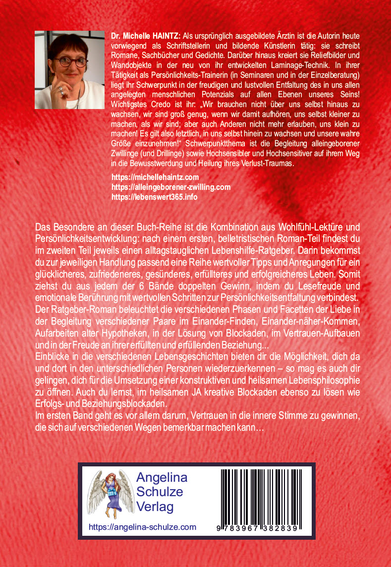 | Schlagworte | Bewusstsein • Beziehung • Beziehungsarbeit • Beziehungsblockaden lösen • Beziehungsfähigkeit • Blockaden lösen • Botschaften der Seele • destruktive Verhaltensmuster • Empathie • Entwicklungspsychologie • glückliche beziehung • innere Stimme • Liebe • Liebesfähigkeit • Liebesgeschichte • Liebesglück • Loslassen • Partnerschaft • Persönlichkeitsentfaltung • Persönlichkeitsentwicklung • Phasen der Liebe • Positive Lebenseinstellung • Ratgeber-Roman • Seele • Seelenarbeit • Selbstsabotage • Vertrauen |