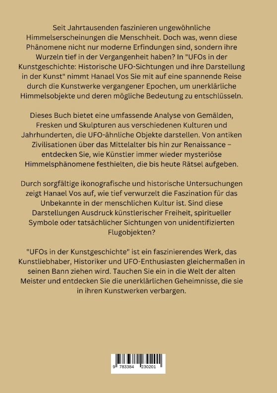 Seit Jahrtausenden faszinieren ungewöhnliche Himmelserscheinungen die Menschheit. Doch was, wenn diese Phänomene nicht nur moderne Erfindungen sind, sondern ihre Wurzeln tief in der Vergangenheit haben? In "UFOs in der Kunstgeschichte: Historische UFO-Sichtungen und ihre Darstellung in der Kunst" nimmt Hanael Vos Sie mit auf eine spannende Reise durch die Kunstwerke vergangener Epochen, um unerklärliche Himmelsobjekte und deren mögliche Bedeutung zu entschlüsseln.Dieses Buch bietet eine umfassende Analyse von Gemälden, Fresken und Skulpturen aus verschiedenen Kulturen und Jahrhunderten, die UFO-ähnliche Objekte darstellen. Von antiken Zivilisationen über das Mittelalter bis hin zur Renaissance - entdecken Sie, wie Künstler immer wieder mysteriöse Himmelsphänomene festhielten, die bis heute Rätsel aufgeben.Durch sorgfältige ikonografische und historische Untersuchungen zeigt Hanael Vos auf, wie tief verwurzelt die Faszination für das Unbekannte in der menschlichen Kultur ist. Sind diese Darstellungen Ausdruck künstlerischer Freiheit, spiritueller Symbole oder tatsächlicher Sichtungen von unidentifizierten Flugobjekten?"UFOs in der Kunstgeschichte" ist ein faszinierendes Werk, das Kunstliebhaber, Historiker und UFO-Enthusiasten gleichermaßen in seinen Bann ziehen wird. Tauchen Sie ein in die Welt der alten Meister und entdecken Sie die unerklärlichen Geheimnisse, die sie in ihren Kunstwerken verbargen.