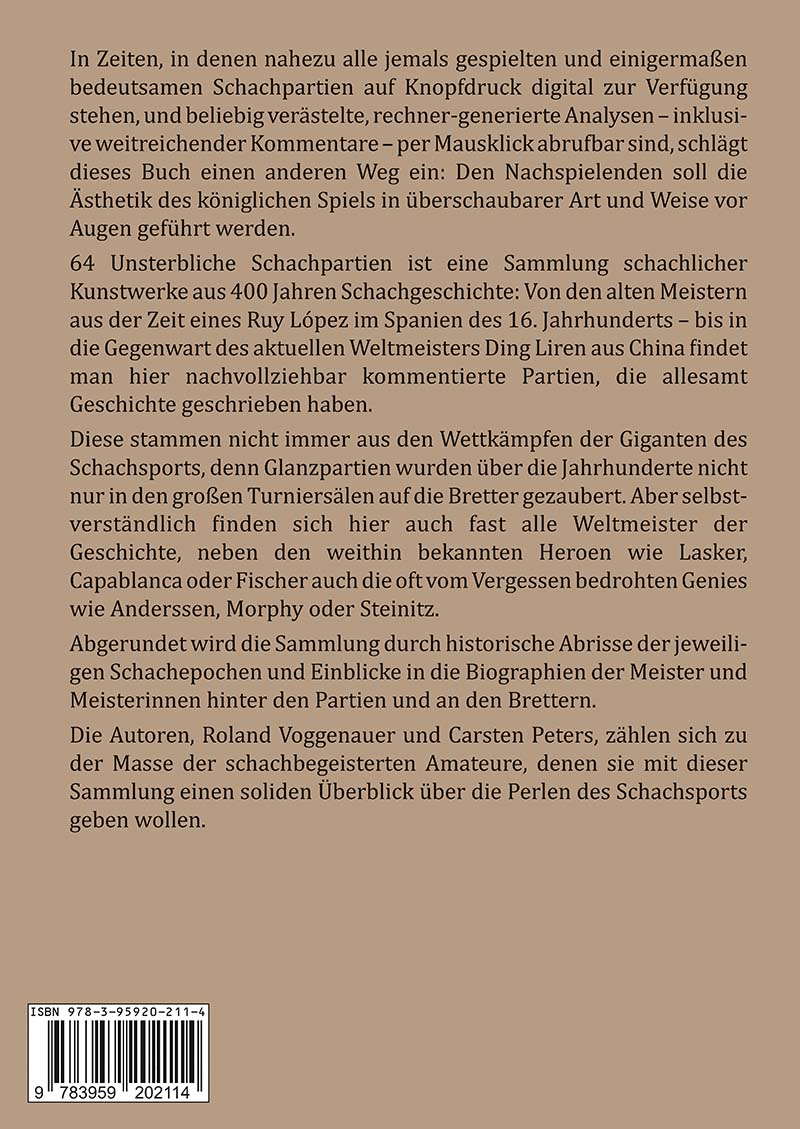 In Zeiten, in denen nahezu alle jemals gespielten und einigermaßen bedeutsamen Schachpartien auf Knopfdruck digital zur Verfügung stehen, und beliebig verästelte, rechnergenerierte Analysen - inklusive weitreichender Kommentare - per Mausklick abrufbar sind, schlägt dieses Buch einen anderen Weg ein: Den Nachspielenden soll die Ästhetik des königlichen Spiels in überschaubarer Art und Weise vor Augen geführt werden.64 Unsterbliche Schachpartien ist eine Sammlung schachlicher Kunstwerke aus 400 Jahren Schachgeschichte: Von den alten Meistern aus der Zeit eines Ruy López im Spanien des 16. Jahrhunderts - bis in die Gegenwart des aktuellen Weltmeisters Ding Liren aus China findet man hier nachvollziehbar kommentierte Partien, die allesamt Geschichte geschrieben haben.Diese stammen nicht immer aus den Wettkämpfen der Giganten des Schachsports, denn Glanzpartien wurden über die Jahrhunderte nicht nur in den großen Turniersälen auf die Bretter gezaubert. Aber selbstverständlich finden sich hier auch fast alle Weltmeister der Geschichte, neben den weithin bekannten Heroen wie Lasker, Capablanca oder Fischer auch die oft vom Vergessen bedrohten Genies wie Anderssen, Morphy oder Steinitz.Abgerundet wird die Sammlung durch historische Abrisse der jeweiligen Schachepochen und Einblicke in die Biographien der Meister und Meisterinnen hinter den Partien und an den Brettern.Die Autoren, Roland Voggenauer und Carsten Peters, zählen sich zu der Masse der schachbegeisterten Amateure, denen sie mit dieser Sammlung einen soliden Überblick über die Perlen des Schachsports geben wollen.