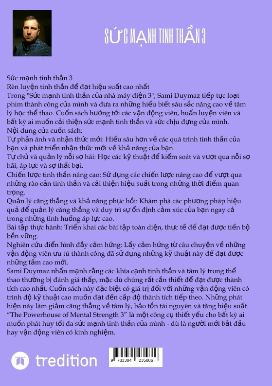 S c m nh tinh th n 3Rèn luy n tinh th n t hi u su t cao nh tTrong "S c m nh tinh th n c a nhà máy i n 3", Sami Duymaz ti p t c lo t phim thành công c a mình và a ra nh ng hi u bi t sâu s c nâng cao v tâm lý h c th thao. Cu n sách h ng t i các v n ng viên, hu n luy n viên và b t k ai mu n c i thi n s c m nh tinh th n và s c ch u ng c a mình.N i dung c a cu n sách:T ph n ánh và nh n th c m i: Hi u sâu h n v các quá trình tinh th n c a b n và phát tri n nh n th c m i v kh nang c a b n.T ch và qu n lý n i s hãi: H c các k thu t ki m soát và v t qua n i s hãi, áp l c và s th t b i.Chi n l c tinh th n nâng cao: S d ng các chi n l c nâng cao v t qua nh ng rào c n tinh th n và c i thi n hi u su t trong nh ng th i i m quan tr ng.Qu n lý cang th ng và kh nang ph c h i: Khám phá các ph ng pháp hi u qu qu n lý cang th ng và duy trì s n nh c m xúc c a b n ngay c trong nh ng tình hu ng áp l c cao.Bài t p th c hành: Tri n khai các bài t p toàn di n, th c t t c ti n b b n v ng.Nghiên c u i n hình y c m h ng: L y c m h ng t câu chuy n v nh ng v n ng viên u tú thành công ã s d ng nh ng k thu t này t c nh ng t m cao m i.Sami Duymaz nh n m nh r ng các khía c nh tinh th n và tâm lý trong th thao th ng b ánh giá th p, m c dù chúng r t c n thi t t c thành tích cao nh t. Cu n sách này c bi t có giá tr i v i nh ng v n ng viên có trình k thu t cao mu n t n c p thành tích ti p theo. Nh ng phát hi n này làm gi m cang th ng v tâm lý, b o t n tài nguyên và tang hi u su t."The Powerhouse of Mental Strength 3" là m t công c thi t y u cho b t k ai mu n phát huy t i a s c m nh tinh th n c a mình - dù là ng i m i b t u hay v n ng viên có kinh nghi m.