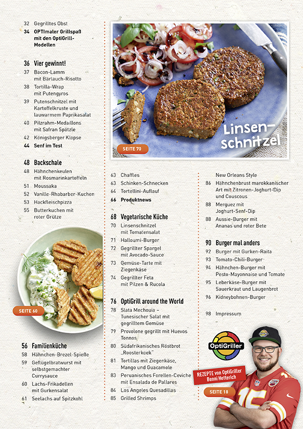Das neue OptiGrill-Magazin pünktlich zum EM-Start: Die UEFA EURO 2024 wird am Freitag, den 14. Juni in München eröffnet und wir alle fiebern bereits diesem Ereignis entgegen! So auch Nelson Müller, der uns im exklusiven Interview seinen geheimen Favoriten verrät. Und natürlich bangen und hoffen wir, ob wir das deutsche Sommermärchen von 2006 noch einmal wiederholen können? Aber auch wenn es mal nicht ganz so gut läuft, kannst Du mit unseren Fußball-Rezepten die Stimmung noch retten und auf jeder Fußball- Party punkten! Der ist der perfekte Teamplayer für das Backstage-Catering bei deinem Public Viewing! So seid ihr bestens gewappnet und sogar bereit für Verlängerung und Elfmeterschießen ...Und überhaupt kann der OptiGrill in diesem Sommer die Hauptrolle als Kochpartner übernehmen: ob beim ersten Angrillen mit unseren Grillklassikern oder bei einer Reise rund um die Welt mit internationalen Spezialitäten. Auch OptiGriller Benni verwöhnt uns mit coolen Barbecue-Beilagen, die ihr direkt zu unseren Special-Burgern testen müsst!Dazu gibt`s neue Lieblings-Familiengerichte und auch die Veggie-Freunde haben wir nicht vergessen. Ihr seht, das Heft ist mal wieder randvoll gepackt mit frischen Kochideen und Rezepten. Also schnapp Dir deinen OptiGrill und freu Dich auf über 98 Seiten Genuss und Grillfreude mit den leckersten Rezepten und tollen Tipps!Viel Vergnügen beim Nachkochen!