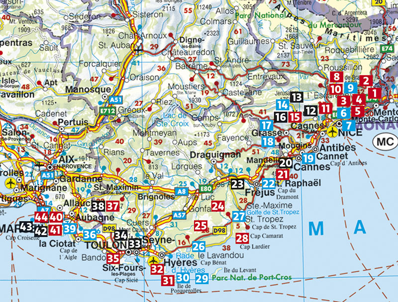 Côte d'Azur: partir en randonnée le long de la côte la plus célèbre d'Europe, peut-être du monde. Se promener dans un paysage en fleurs qui n'est que couleurs, senteurs et saveurs marines. Le long de baies de rêve, sur le haut plateau de Grasse, mais aussi dans les Alpes maritimes jusqu'à des sommets montagneux culminant à 1500 m depuis lesquels la vue porte d'un côté sur les Alpes, de l'autre sur la Mer Méditerranée.