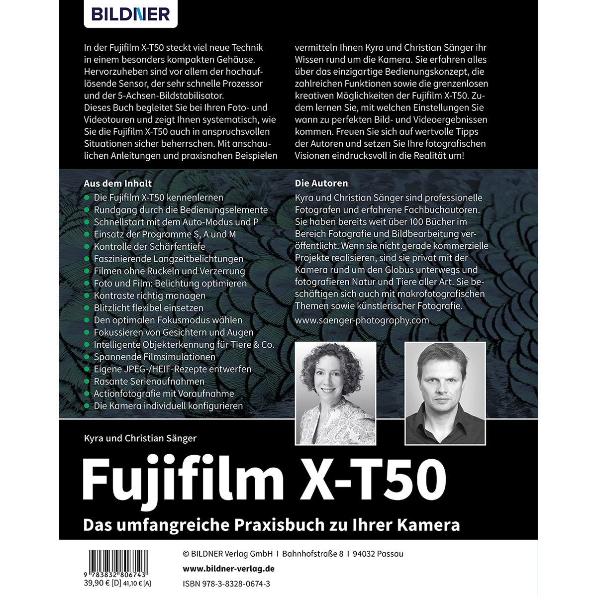 In der Fujifilm X-T50 steckt viel neue Technik in einem besonders kompakten Gehäuse. Hervorzuheben sind vor allem der hochauflösende Sensor, der sehr schnelle Prozessor und der 5-Achsen-Bildstabilisator. Dieses Buch begleitet Sie bei Ihren Foto- und Videotouren und zeigt Ihnen systematisch, wie Sie die Fujifilm X-T50 auch in anspruchsvollen Situationen sicher beherrschen. Mit anschaulichen Anleitungen und praxisnahen Beispielen vermitteln Ihnen Kyra und Christian Sänger ihr Wissen rund um die Kamera. Sie erfahren alles über das einzigartige Bedienkonzept, die zahlreichen Funktionen sowie die grenzenlosen kreativen Möglichkeiten der Fujifilm X-T50. Zudem lernen Sie, mit welchen Einstellungen Sie wann zu perfekten Bild- und Videoergebnissen kommen. Freuen Sie sich auf wertvolle Tipps der Autoren und setzen Sie Ihre fotografischen Visionen eindrucksvoll in die Realität um!