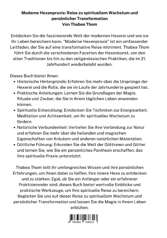 Entdecken Sie die faszinierende Welt der modernen Hexerei und wie sie Ihr Leben bereichern kann. "Moderne Hexenpraxis" ist ein umfassender Leitfaden, der Sie auf eine transformative Reise mitnimmt. Thabea Thom führt Sie durch die verschiedenen Facetten der Hexenkunst, von den alten Traditionen bis hin zu den zeitgenössischen Praktiken, die im 21. Jahrhundert wiederbelebt wurden.Dieses Buch bietet Ihnen:* Historische Hintergründe: Erfahren Sie mehr über die Ursprünge der Hexerei und die Rolle, die sie im Laufe der Jahrhunderte gespielt hat.* Praktische Anleitungen: Lernen Sie die Grundlagen der Magie, Rituale und Zauber, die Sie in Ihrem täglichen Leben anwenden können.* Spirituelle Entwicklung: Entdecken Sie Techniken zur Energiearbeit, Meditation und Achtsamkeit, um Ihr spirituelles Wachstum zu fördern.* Natürliche Verbundenheit: Vertiefen Sie Ihre Verbindung zur Natur und erfahren Sie mehr über die heilenden und magischen Eigenschaften von Kräutern und anderen natürlichen Materialien.* Göttliche Führung: Erkunden Sie die Welt der Göttinnen und Götter und lernen Sie, wie Sie ein persönliches Pantheon erschaffen, das Ihre spirituelle Praxis unterstützt.Thabea Thom teilt ihr umfangreiches Wissen und ihre persönlichen Erfahrungen, um Ihnen dabei zu helfen, Ihre innere Hexe zu entdecken und zu stärken. Egal, ob Sie ein Anfänger oder ein erfahrener Praktizierender sind, dieses Buch bietet wertvolle Einblicke und praktische Werkzeuge, um Ihre spirituelle Reise zu bereichern.Begleiten Sie uns auf dieser Reise zu spirituellem Wachstum und persönlicher Transformation und lassen Sie die Magie in Ihrem Leben erblühen.